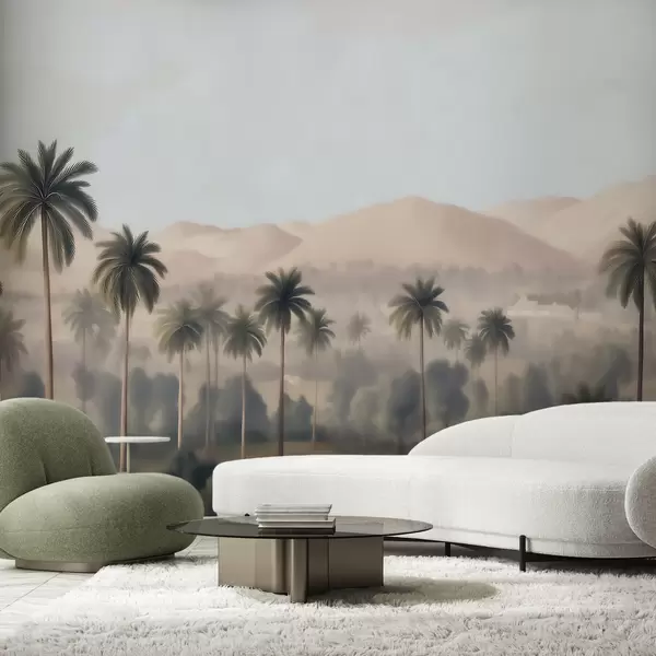 Тапете за зид Тропски пејзаж са палмама и планинама, винтаге панорама у беж и зеленим тоновима бр. w09798