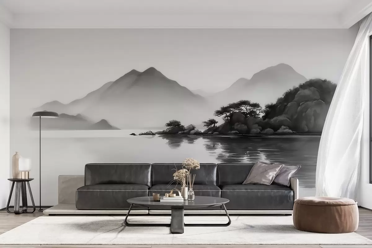 Тапете за зид Црно-бели пејзаж са планинама и језером у мекој магли бр. w09803