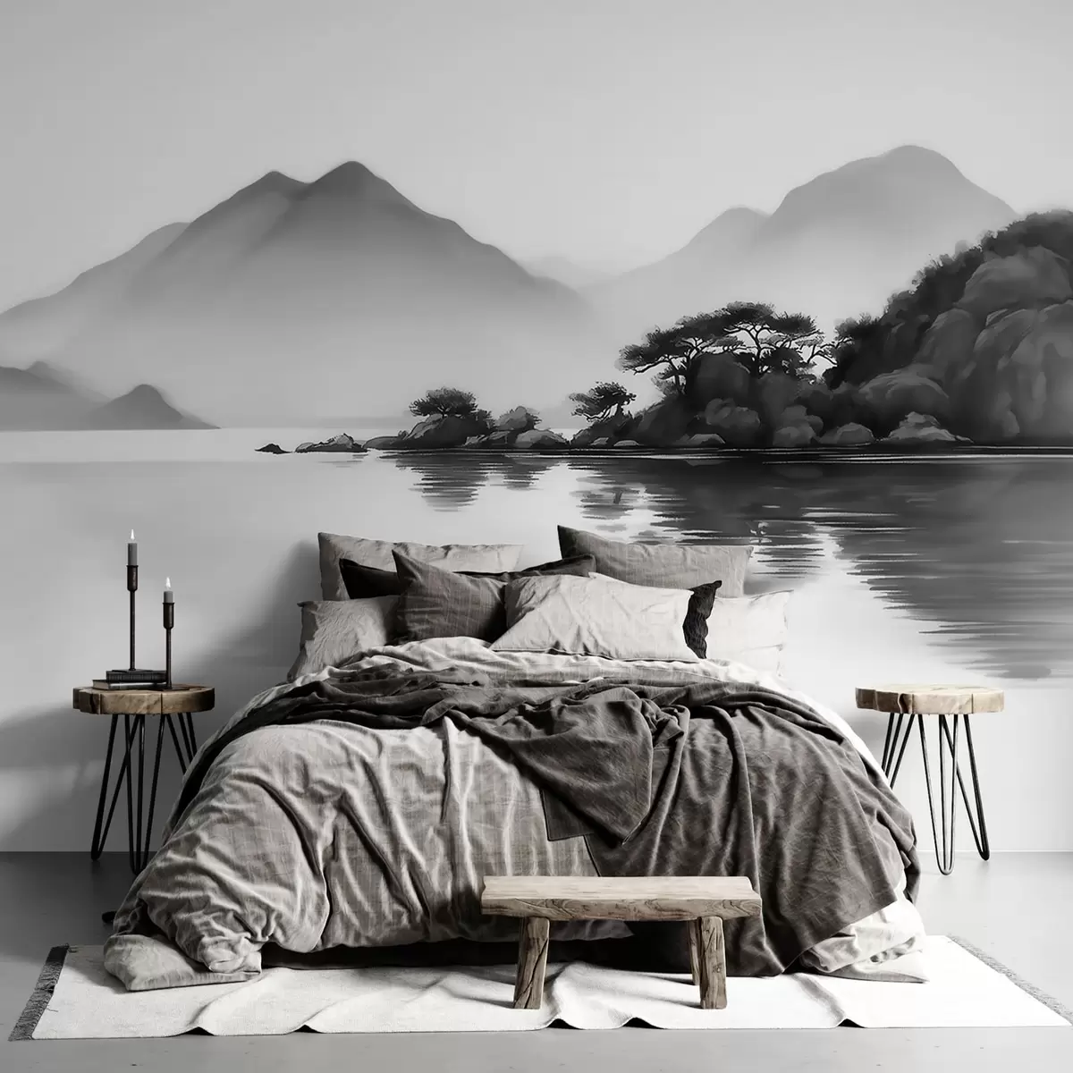 Тапете за зид Црно-бели пејзаж са планинама и језером у мекој магли бр. w09803