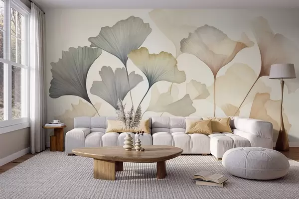 Тапете за зид Апстрактни листови гинка у пригушеним пастелним бојама попут плаве, зелене и брескве, текстурирана уметност бр. w09810