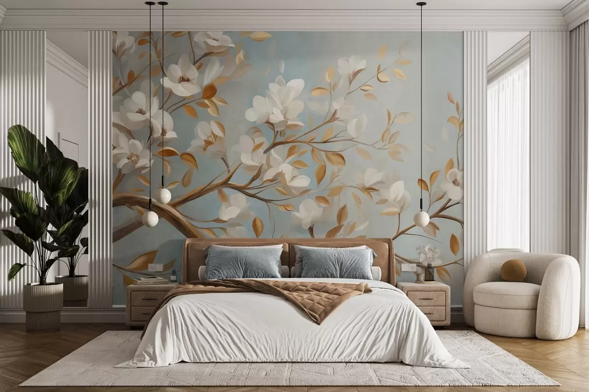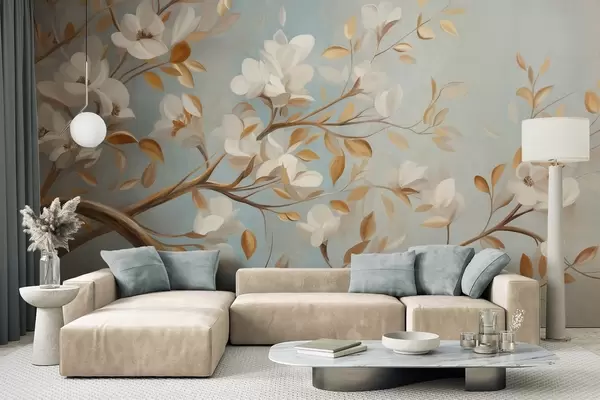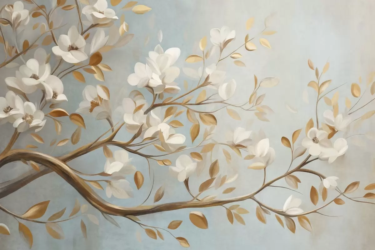 Тапете за зид Текстурирана грана дрвета са белим цвећем и жутим листовима, винтаге стил бр. w09814
