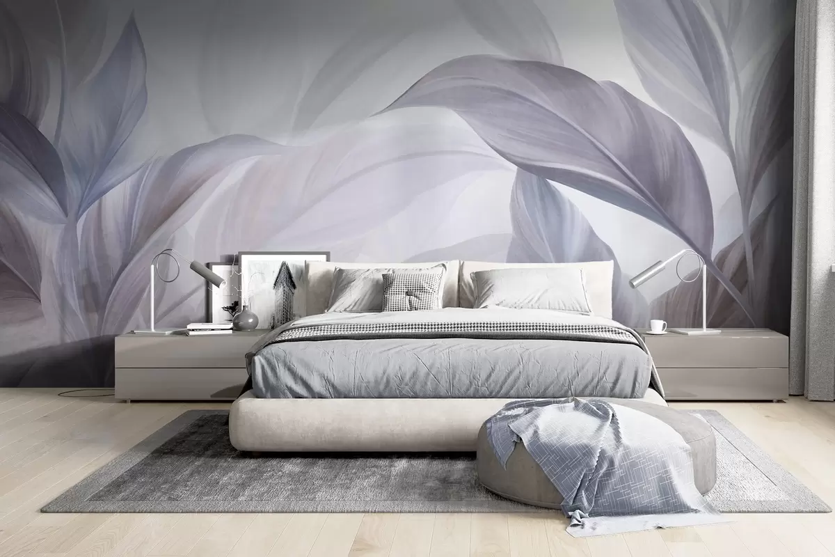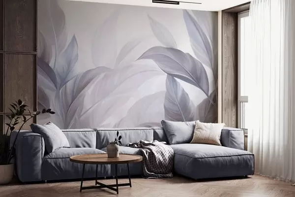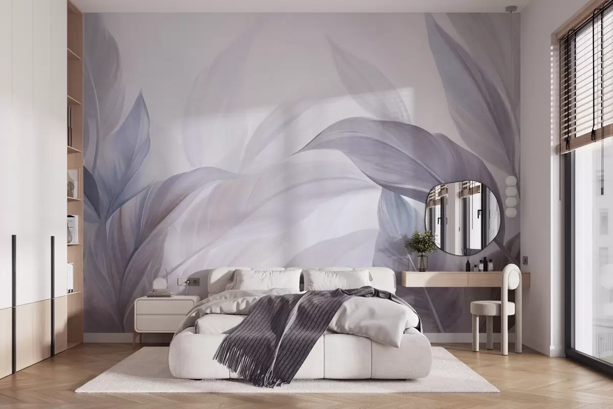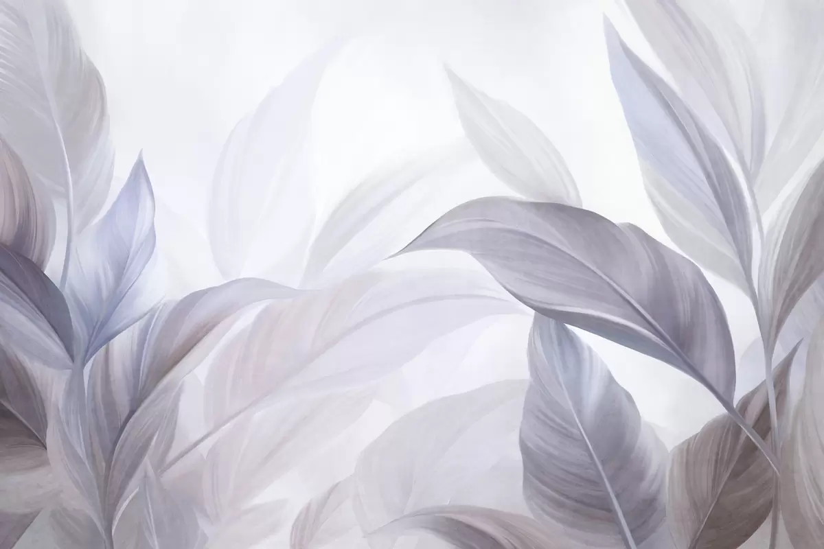 Тапете за зид Велики, бледоплави и љубичасти тропски листови са меким, пастелним бојама, текстурирана уметност бр. w09816v1