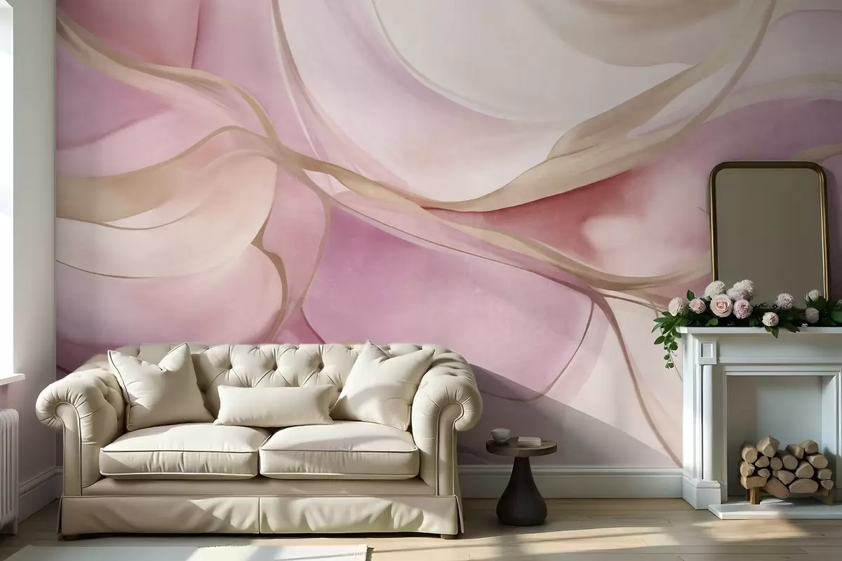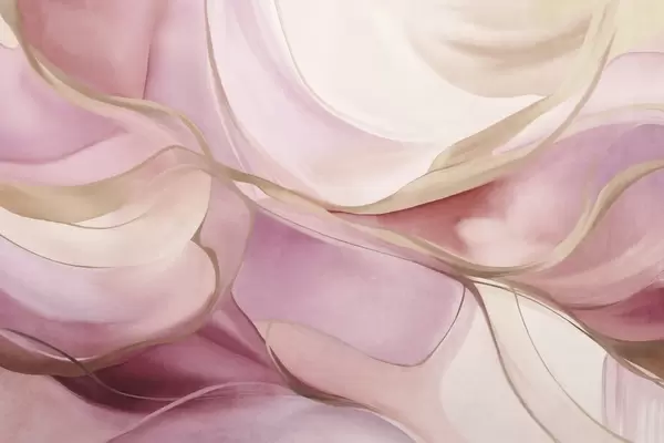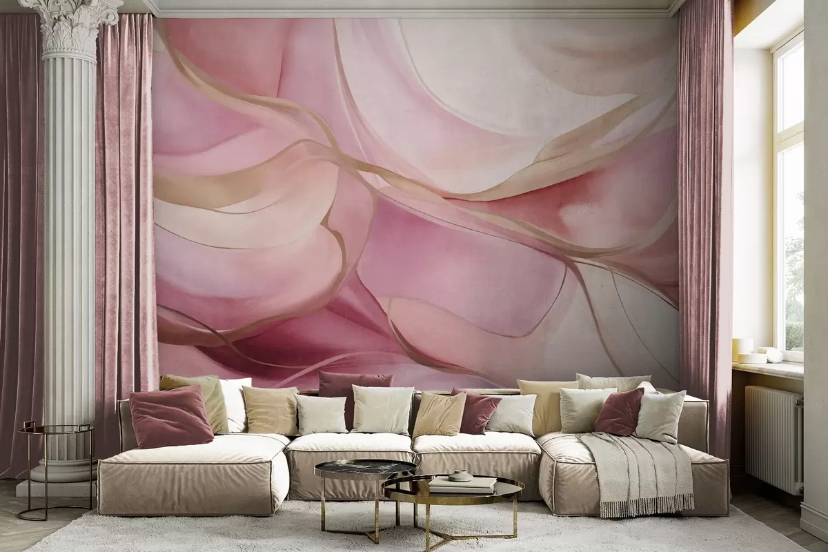Тапете за зид Апстрактни текстурирани течни облици у нијансама ружичасте и беж боје са нежним жутим линијама бр. w09818