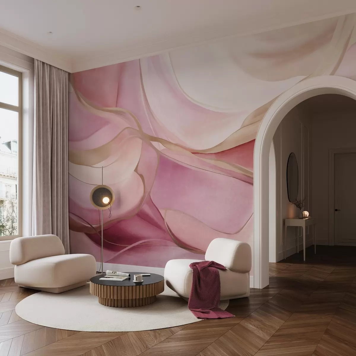 Тапете за зид Апстрактни текстурирани течни облици у нијансама ружичасте и беж боје са нежним жутим линијама бр. w09818