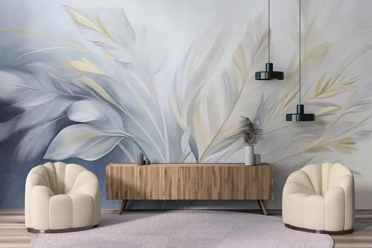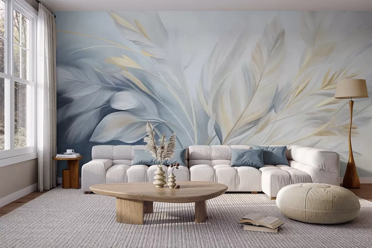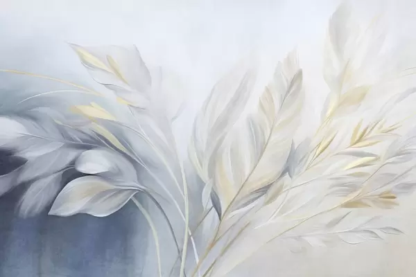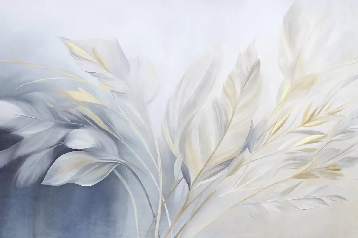 Тапете за зид Текстурирано перје са жутим акцентима, на мекој позадини бледоплаве и беле боје бр. w09826