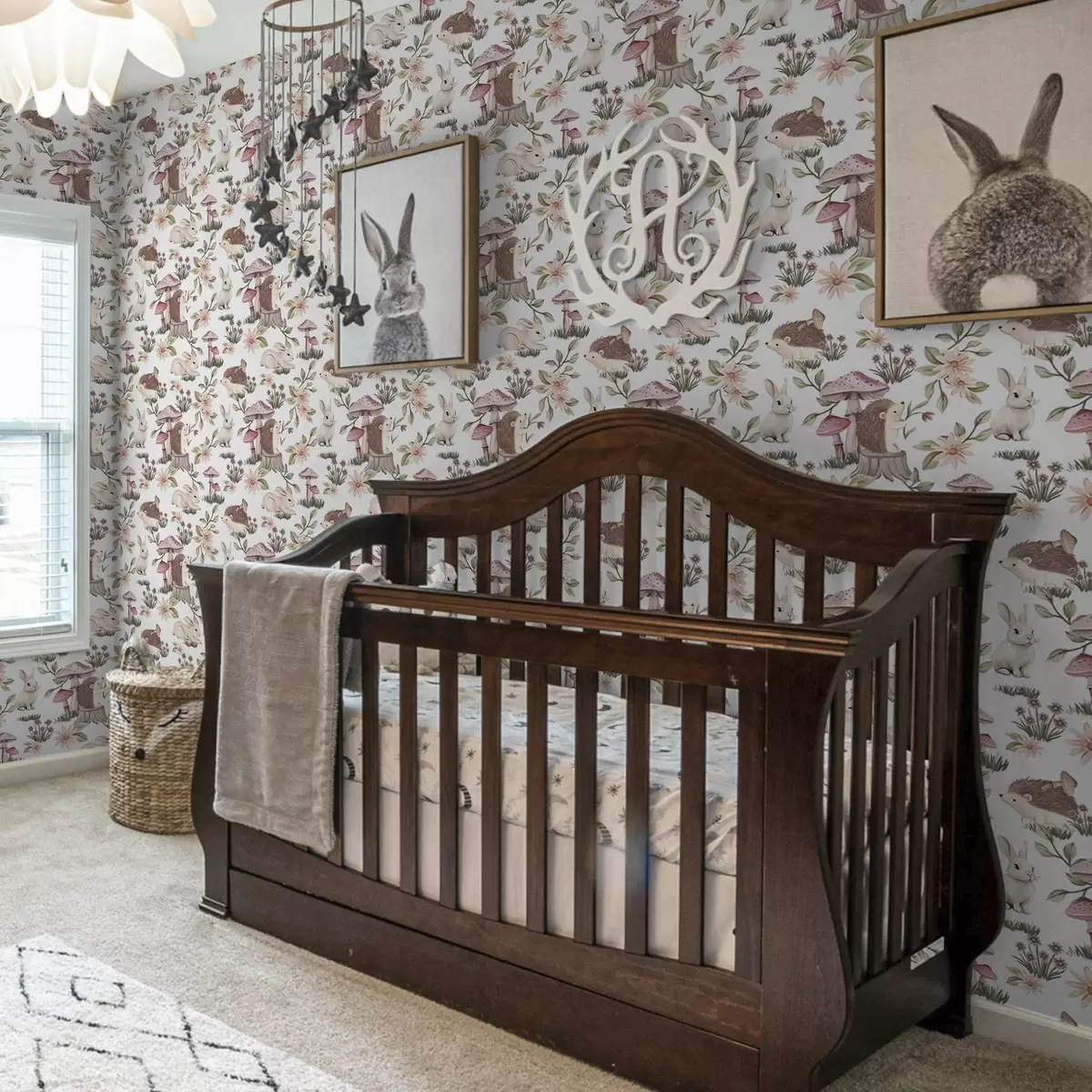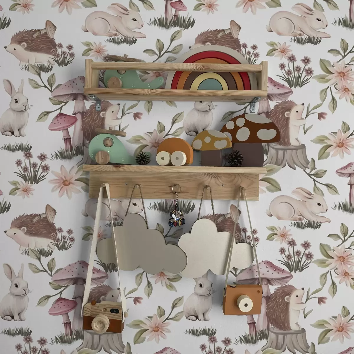 Tapeta Јежеви и зечеви на белој позадини са деликатним цвећем и печуркама бр. a00111v2