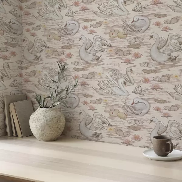 Tapeta Лабудови са пилићима на ружичастој позадини са локвањама бр. a00176