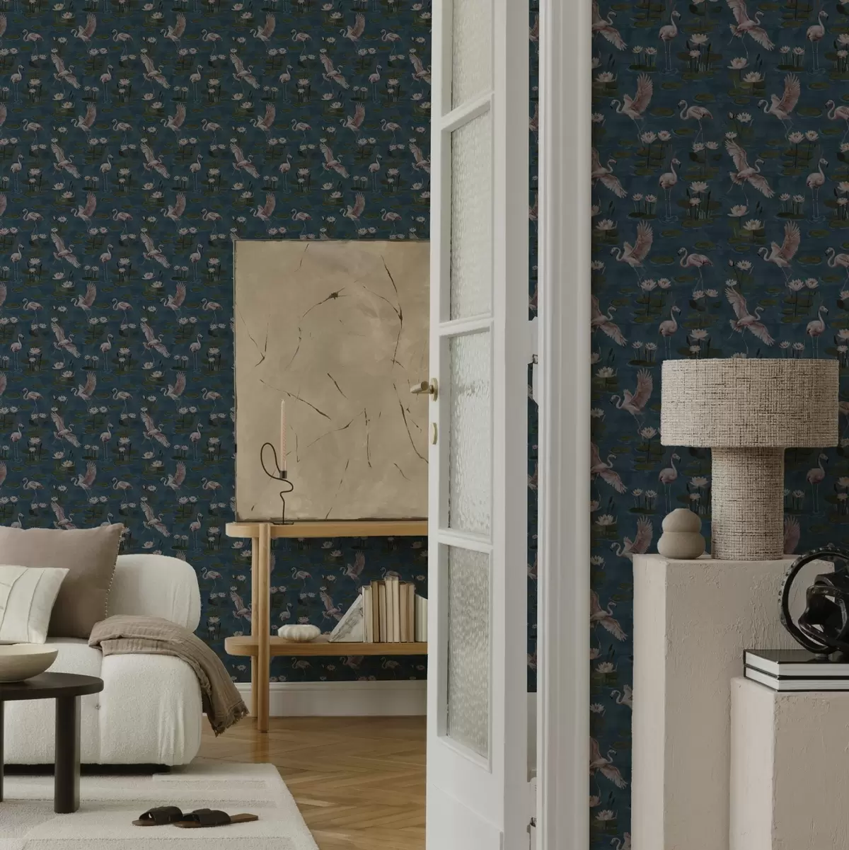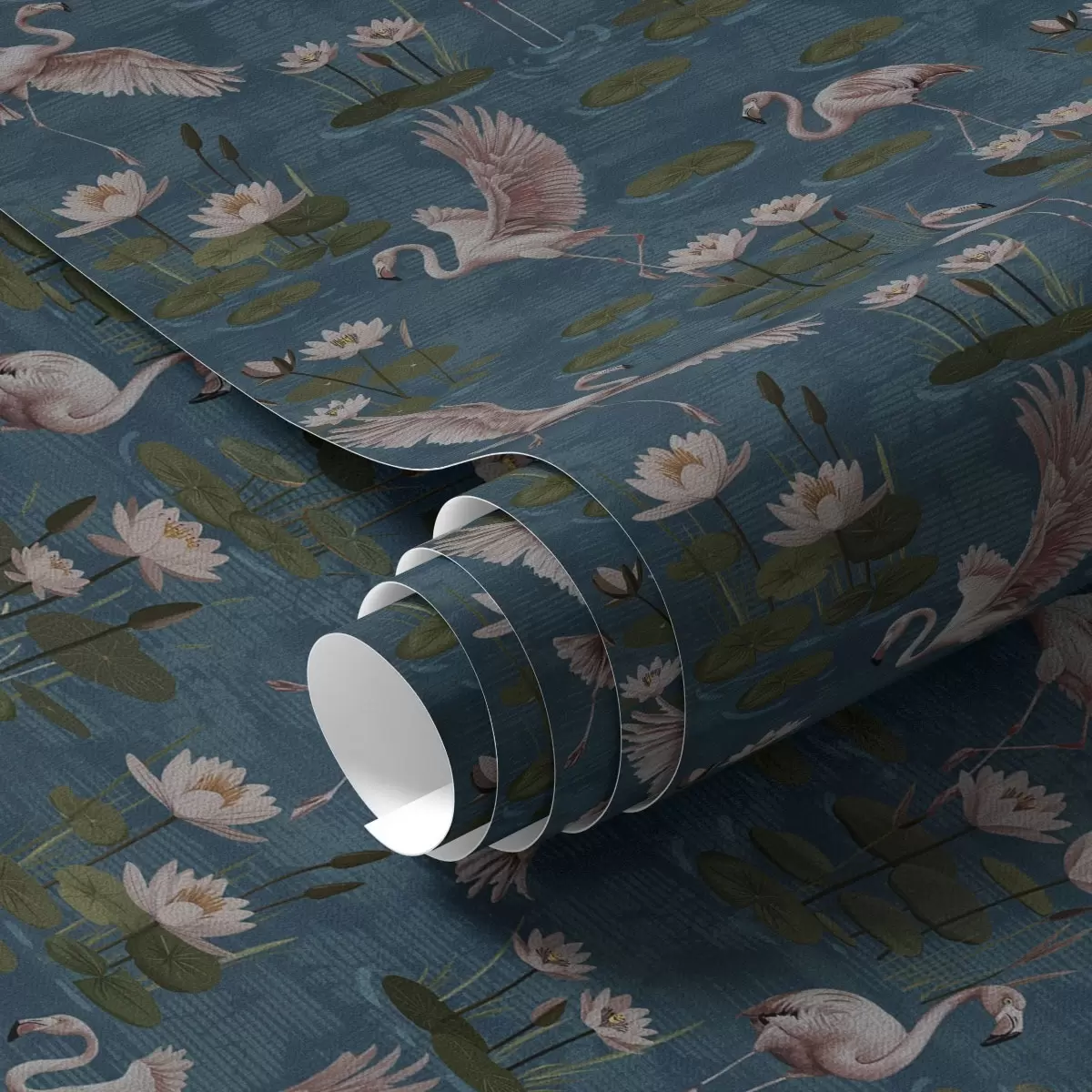 Tapeta Фламинго међу локвањама, тропски призор на тамноплавој позадини бр. a00237