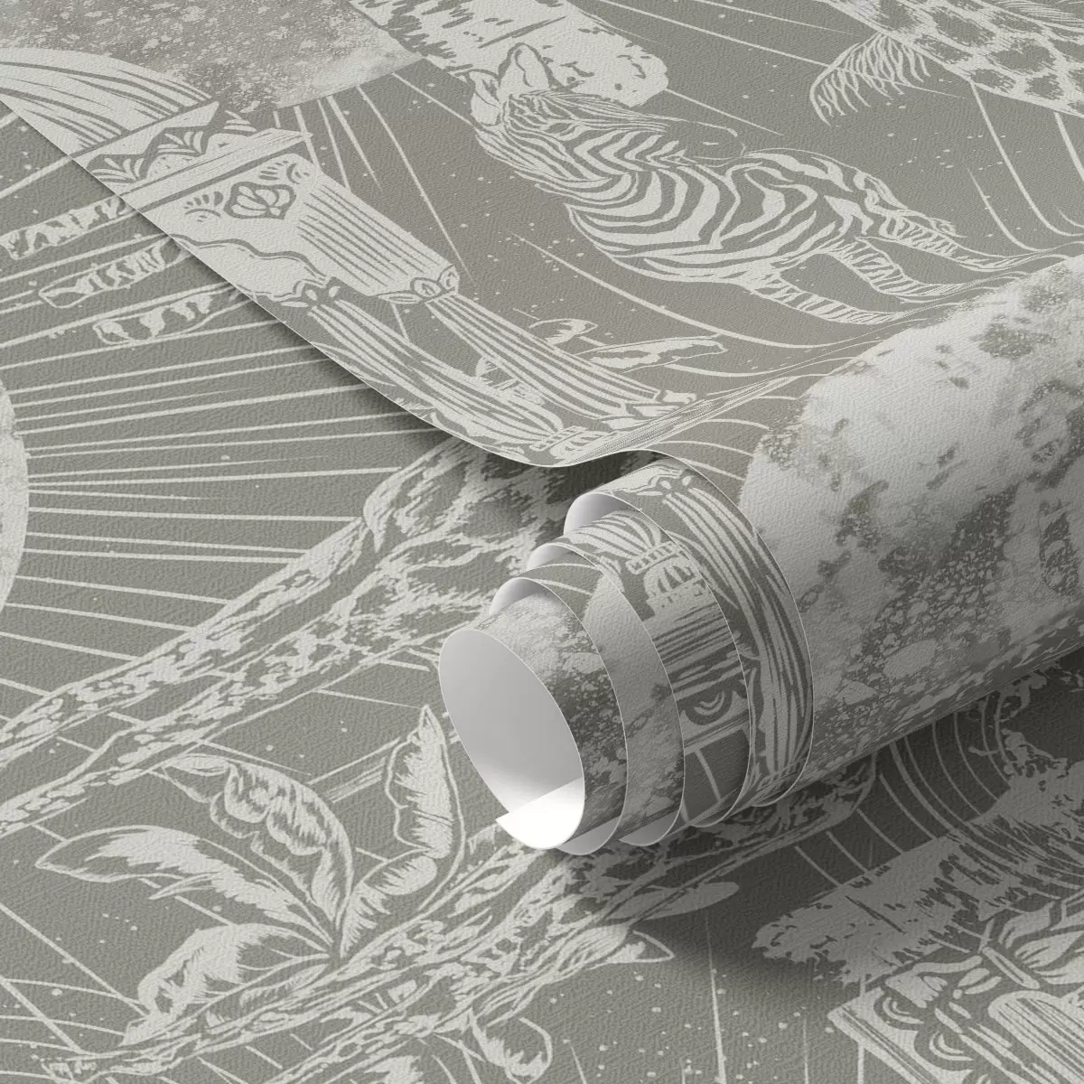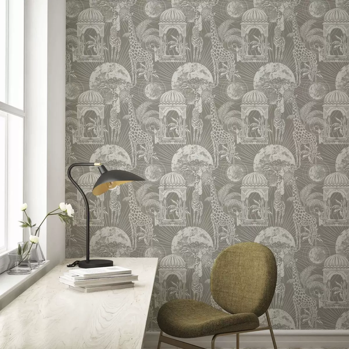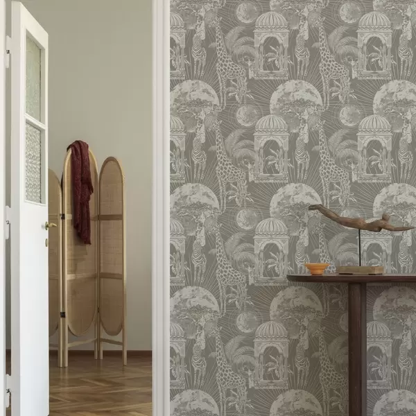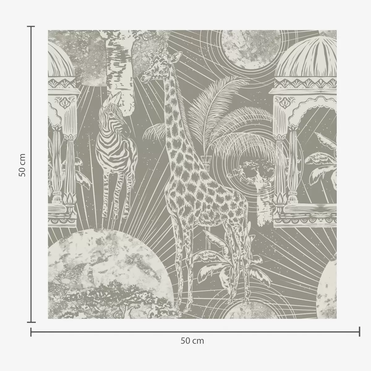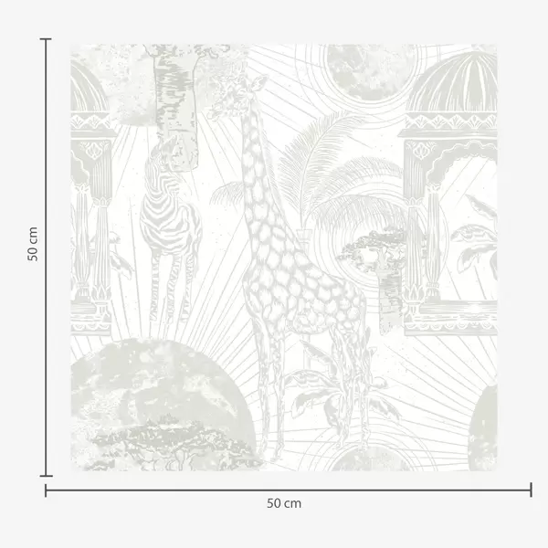 Tapeta Жирафа и зебра на позадини архитектуре и тропског дрвећа бр. a00276