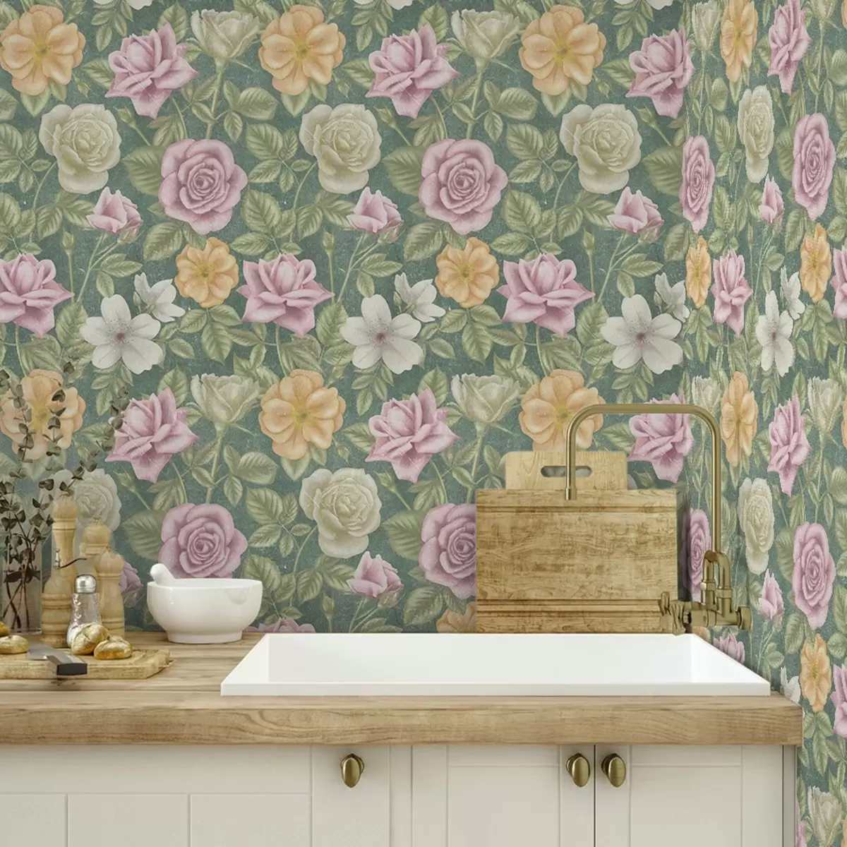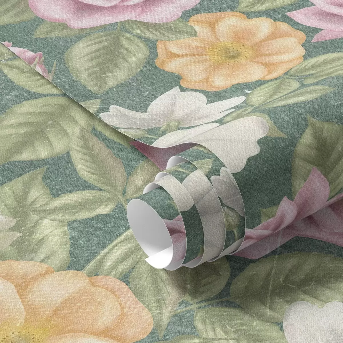 Tapeta Ружичасте кремасте и жуте руже на зеленој позадини бр. a00300