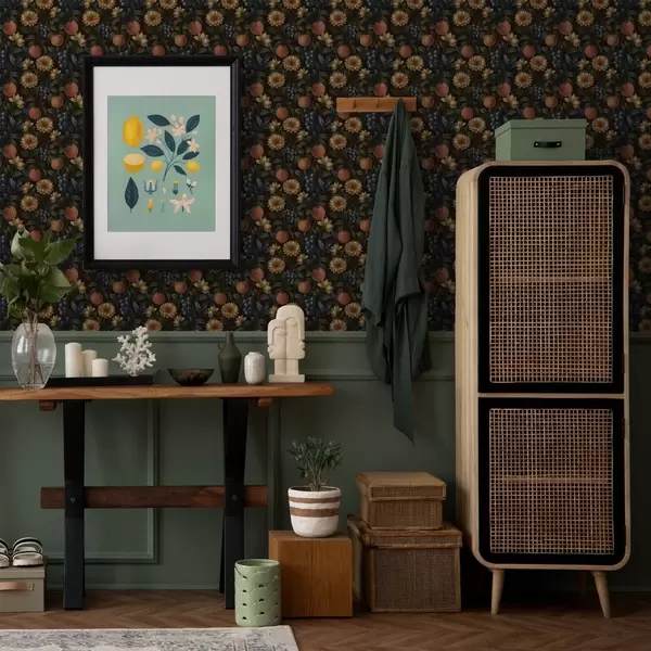 Tapeta Воће и жуто цвеће на тамној ботаничкој позадини бр. a00395