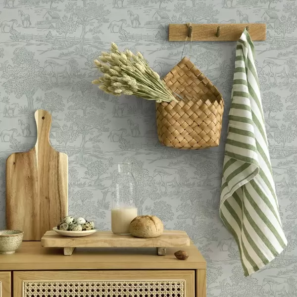 Tapeta Зелени монохроматски пејзаж са коњима и колибама бр. a00407