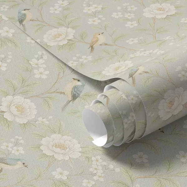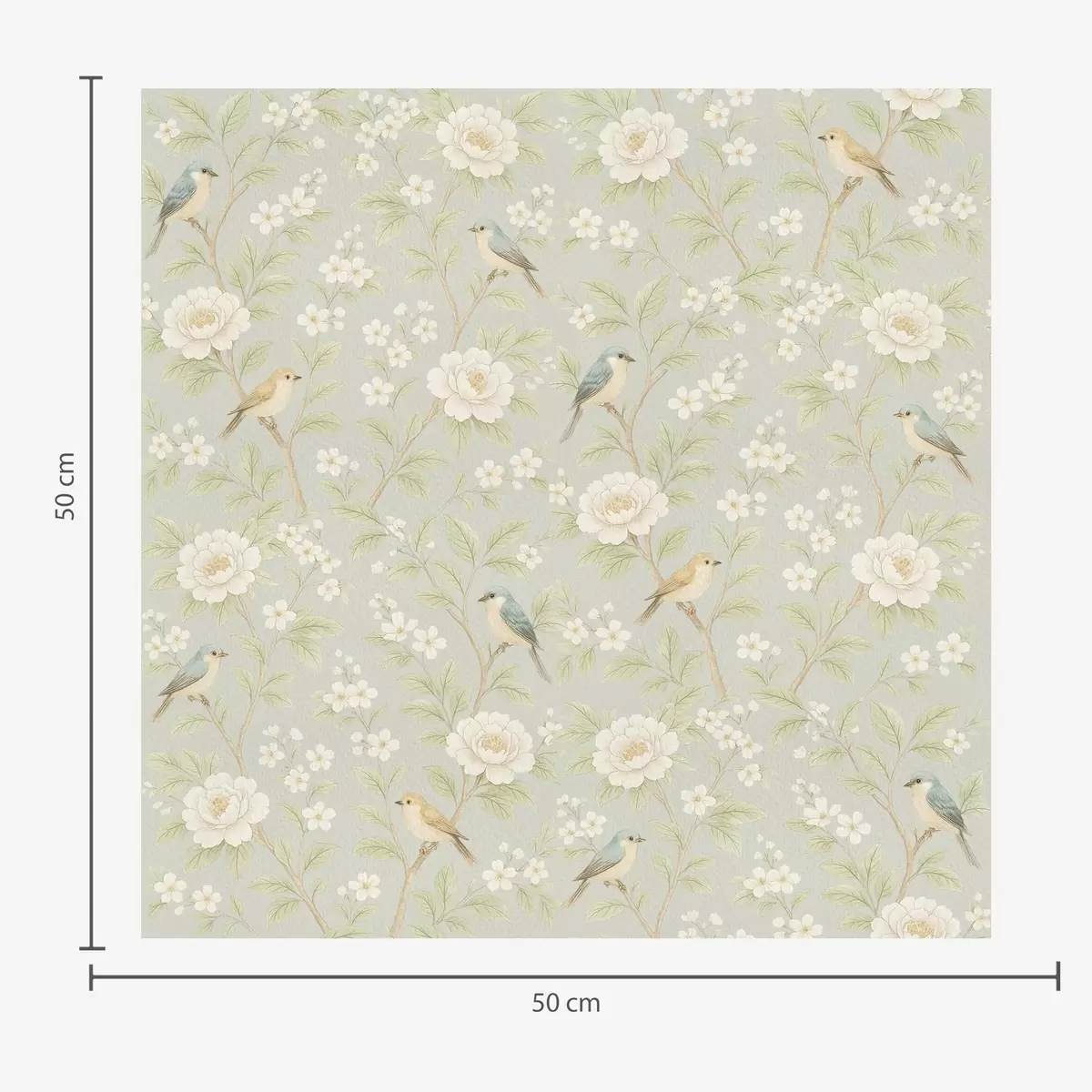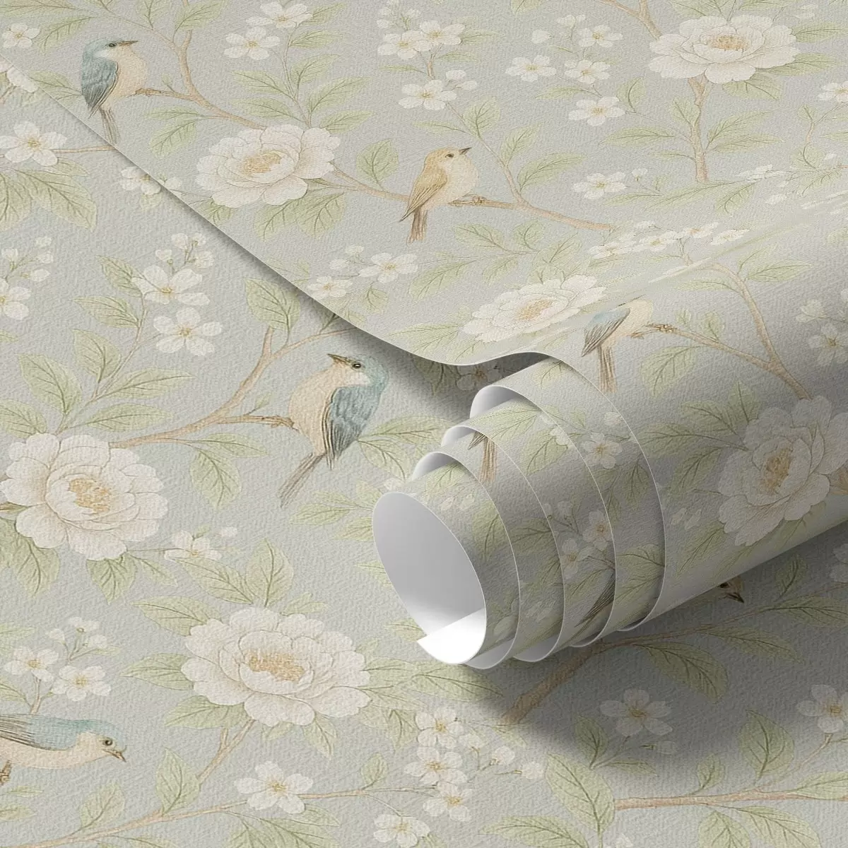 Tapeta Птице међу белим цветовима на сиво-зеленој позадини бр. a00583