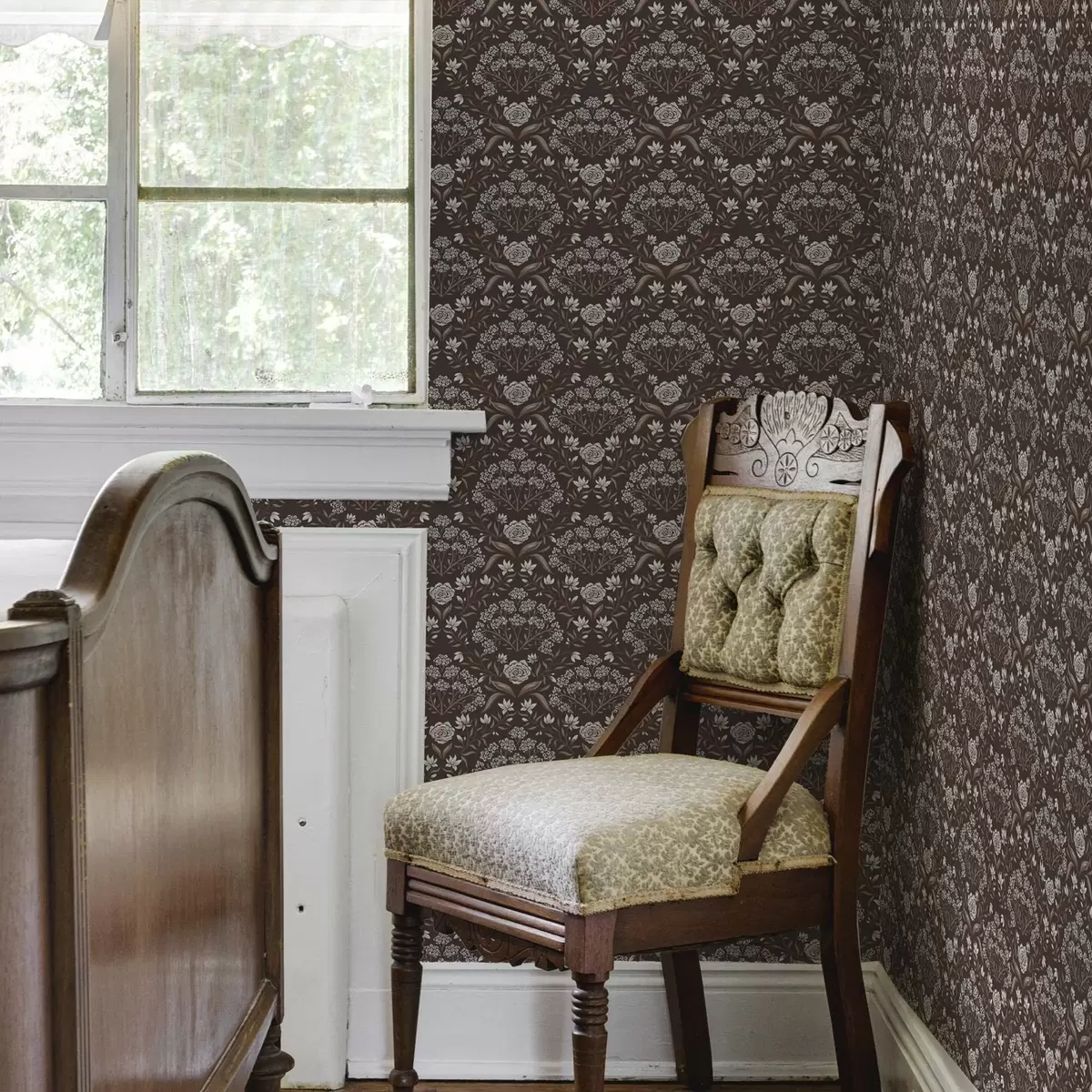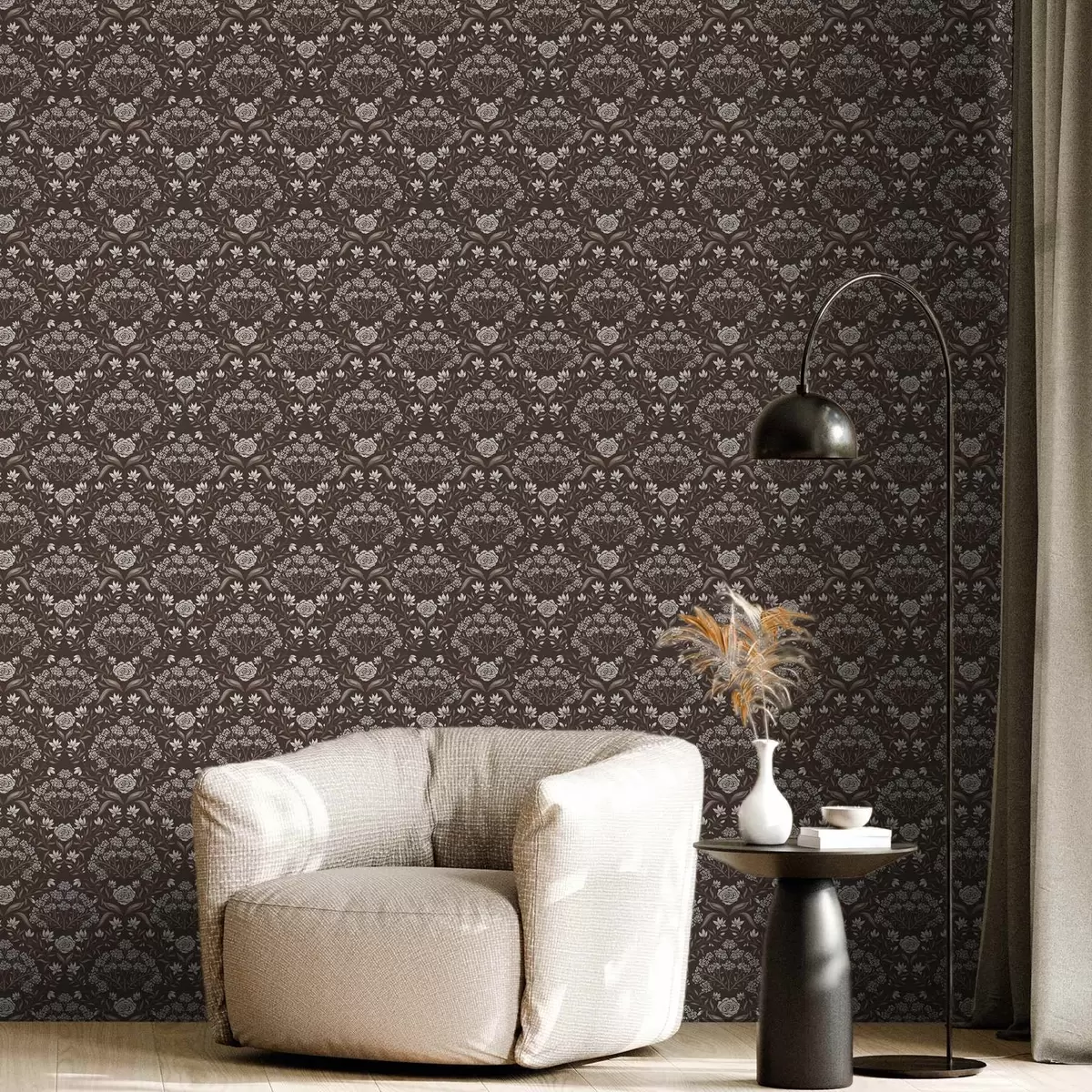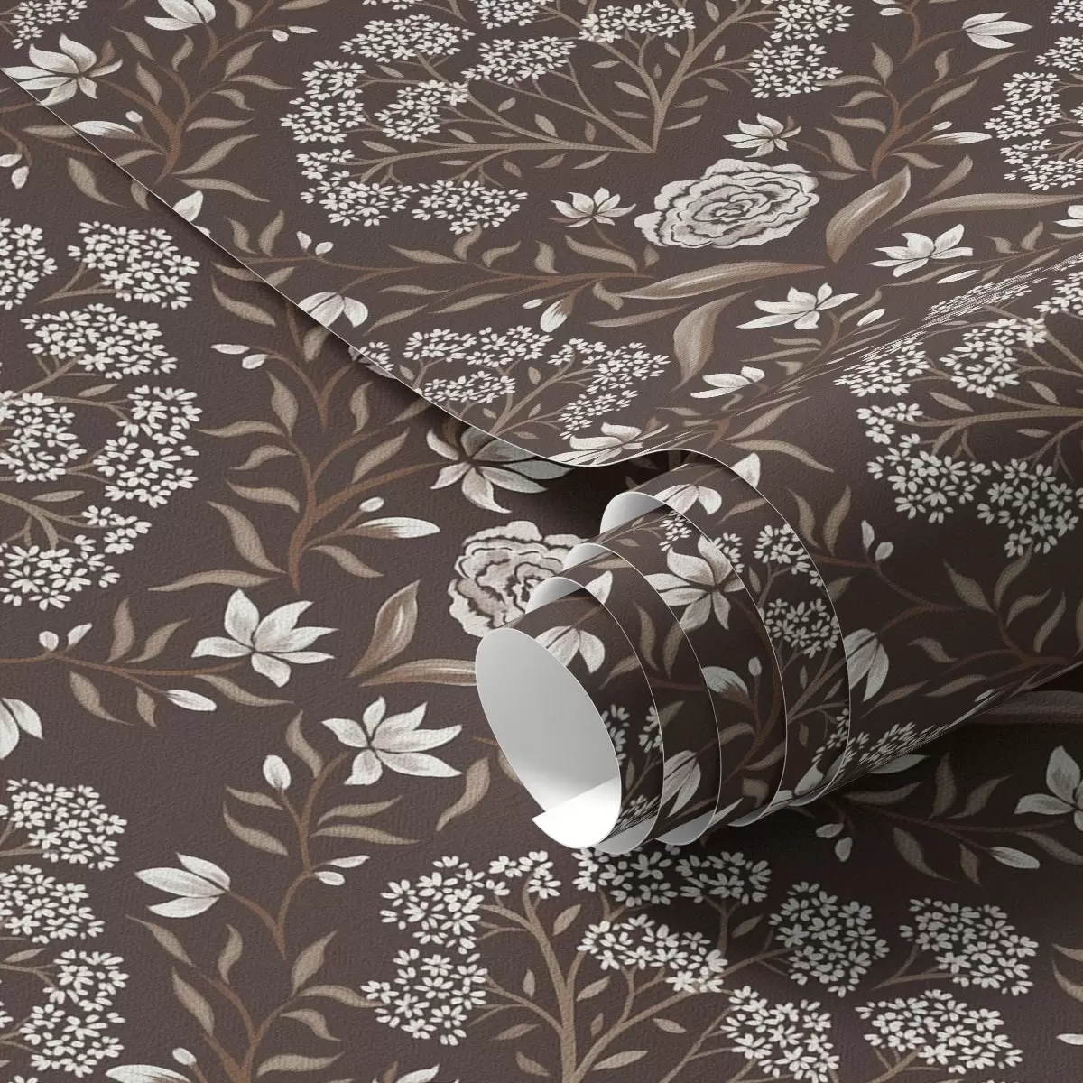 Tapeta Дамаск од тамне чоколаде са божурима и висибабама бр. a00603v2