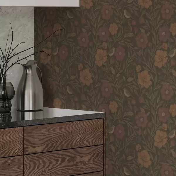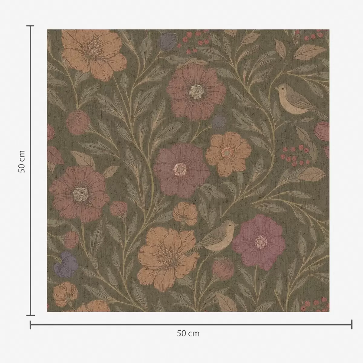 Tapeta Јесење цвеће и птице на маслинасто-смеђој позадини бр. a00605
