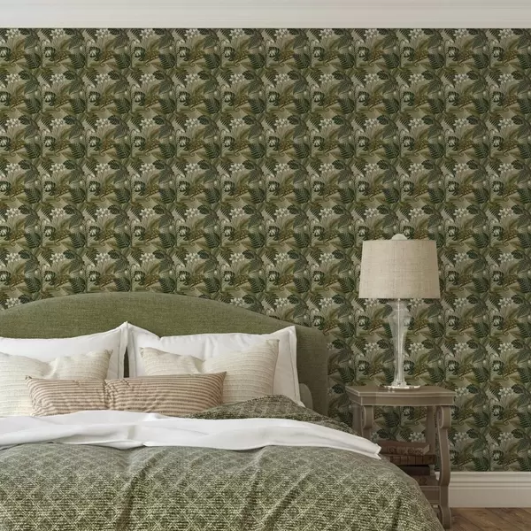 Tapeta Камелеони и тропско лишће, бело цвеће, беж тло бр. a00608