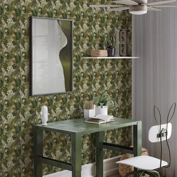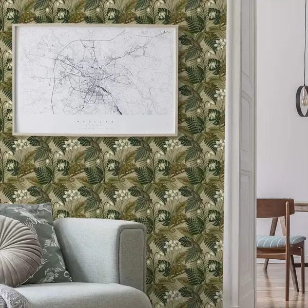Tapeta Камелеони и тропско лишће, бело цвеће, беж тло бр. a00608