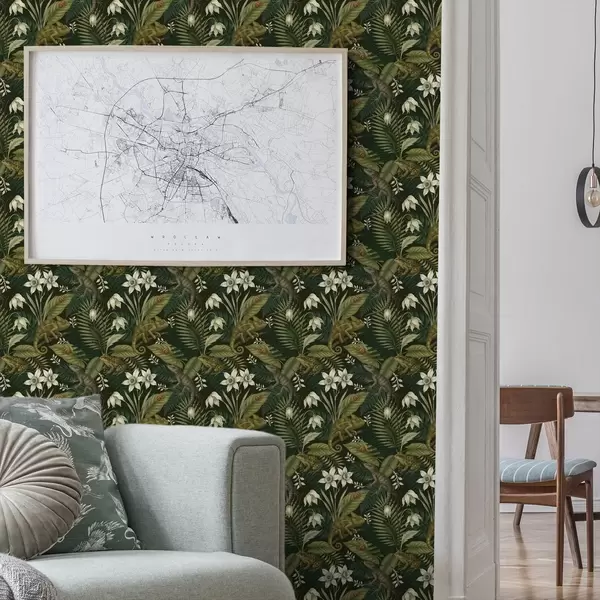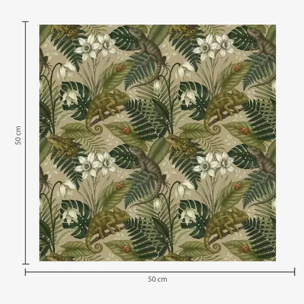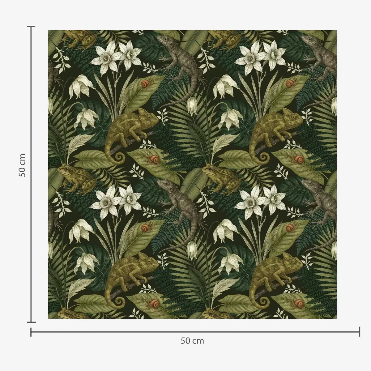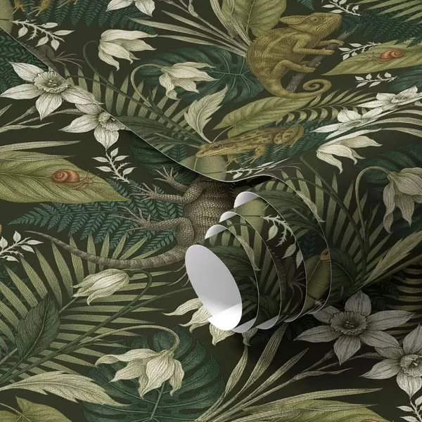 Tapeta Камелеони и тропско лишће, бело цвеће, тамно тло бр. a00608v1