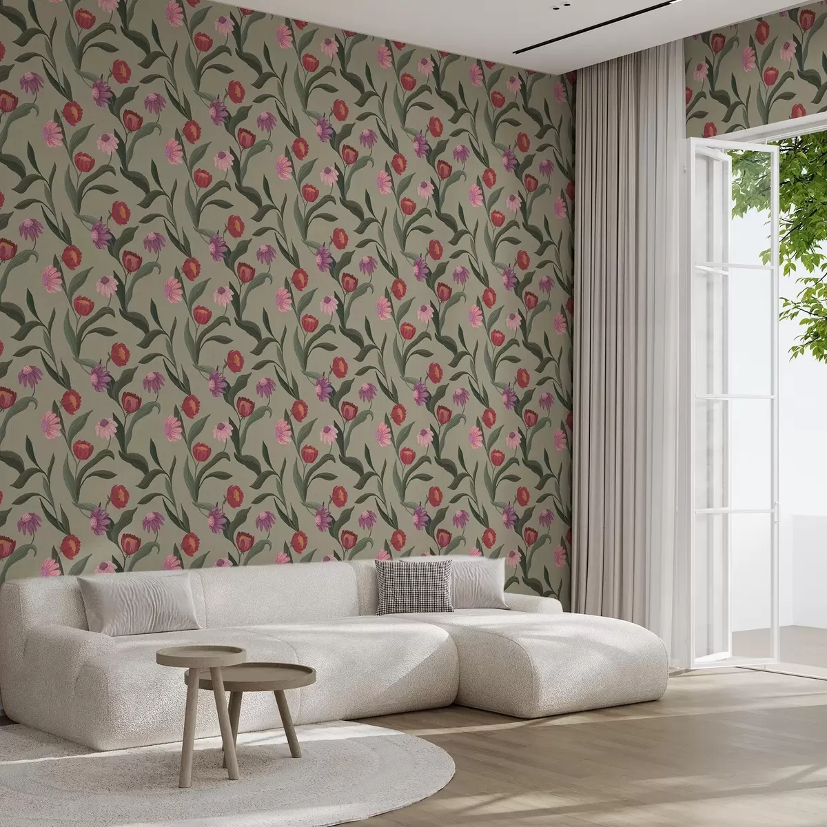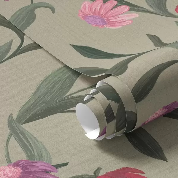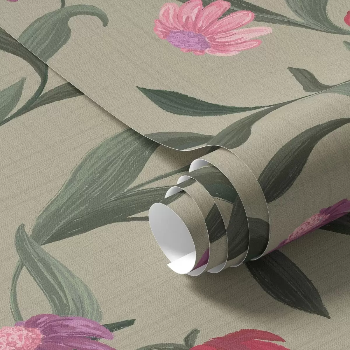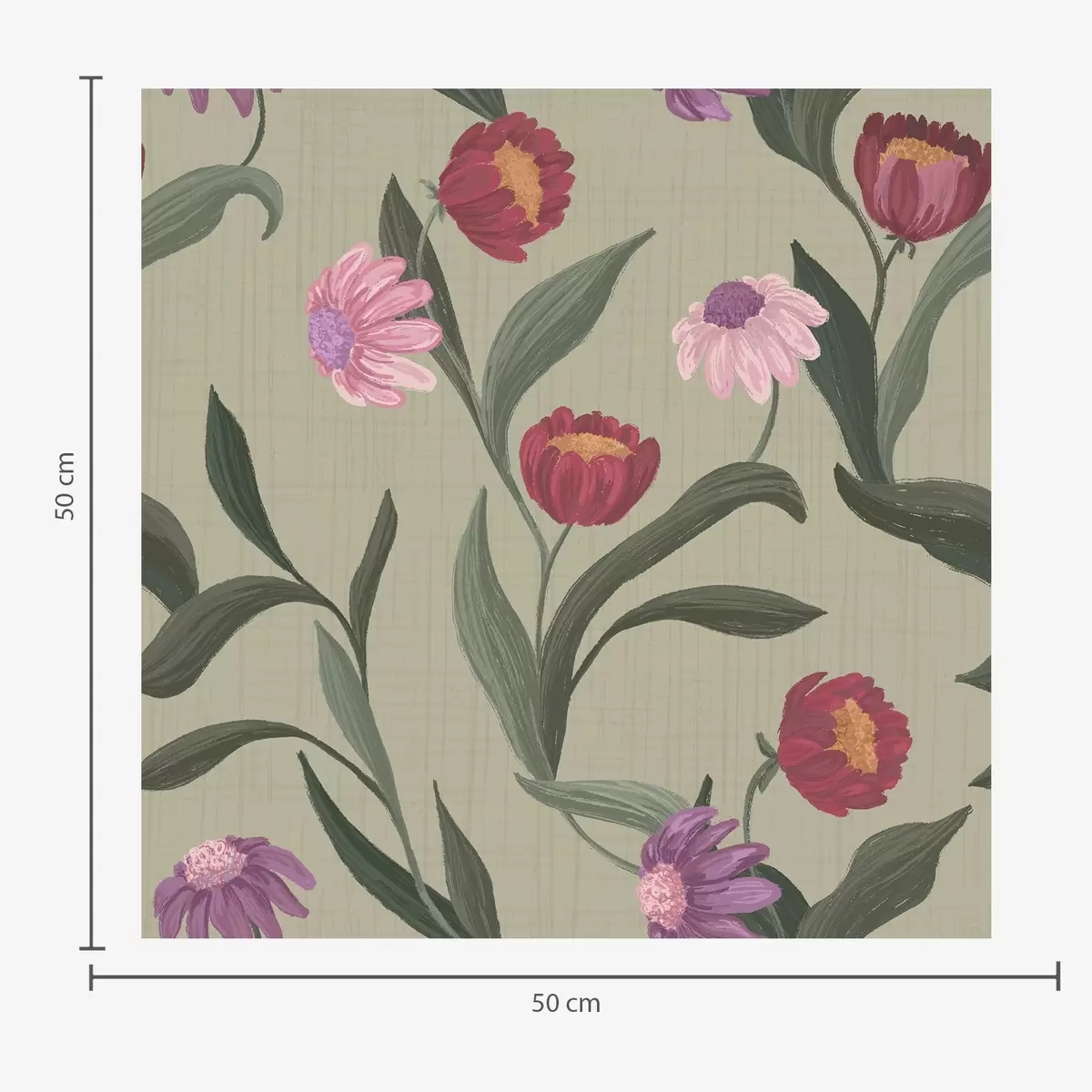 Tapeta Ружичасто-црвени цветови на маслинастој позадини, текстура платна бр. a00631v1