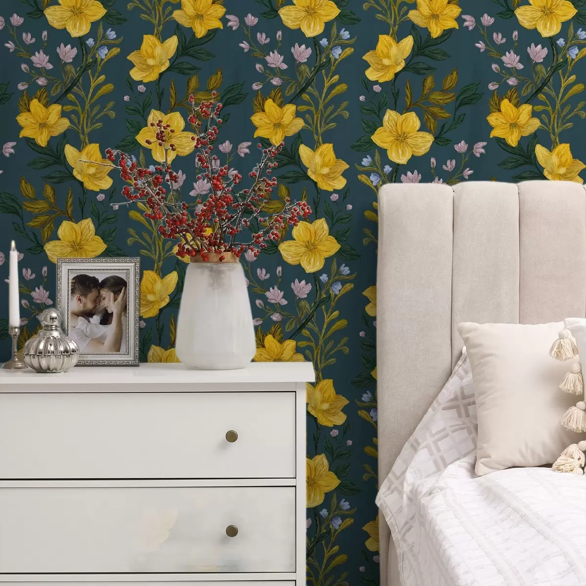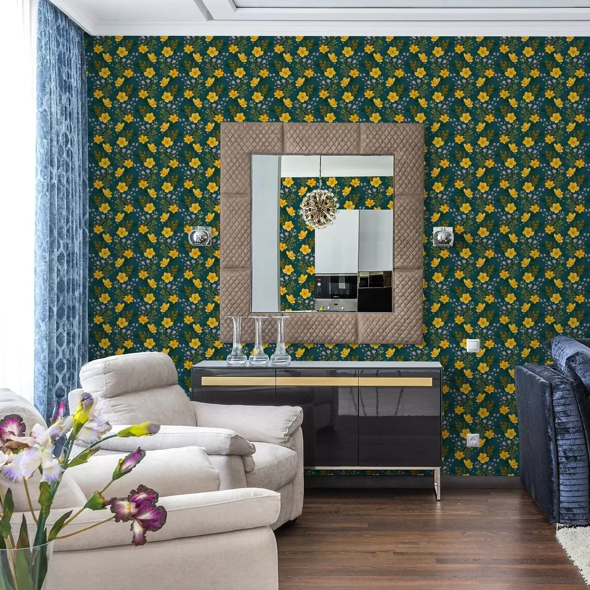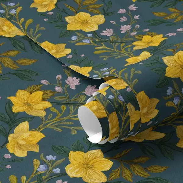 Tapeta Жуто цвеће у вертикалним гирландама на тамноплавој позадини бр. a00632v2