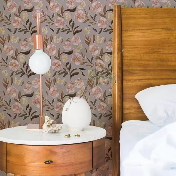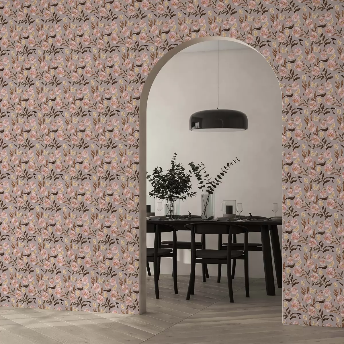 Tapeta Ружичасти цветови и лептири на сиво-беж позадини бр. a00633