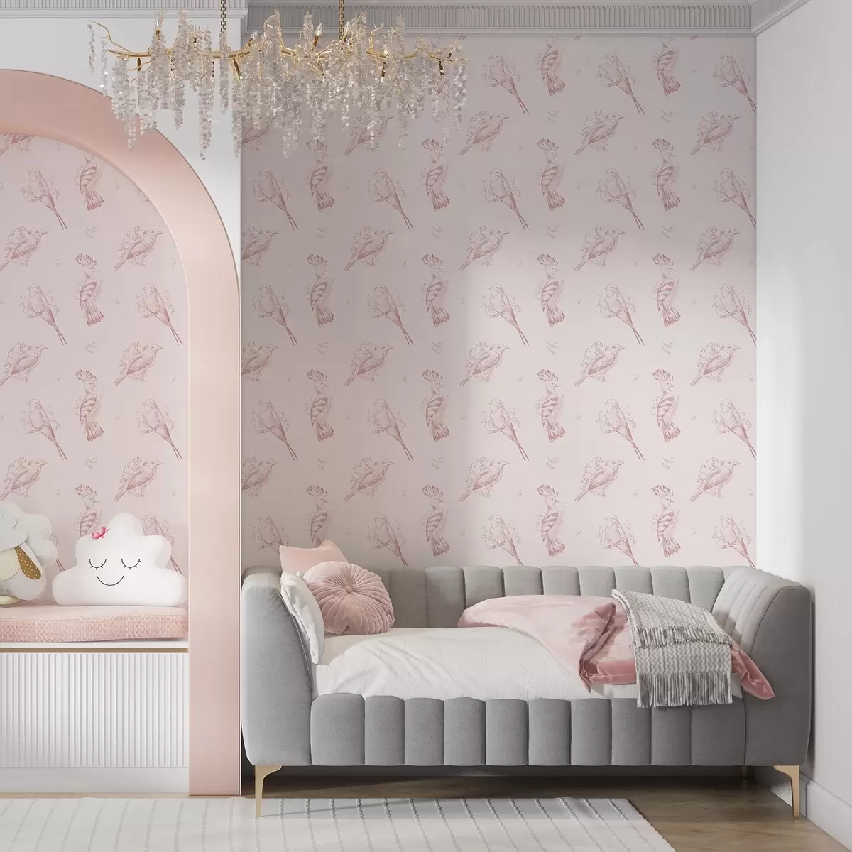 Tapeta Птичји тоалет: скице птица, нежно ружичаста позадина бр. a00656