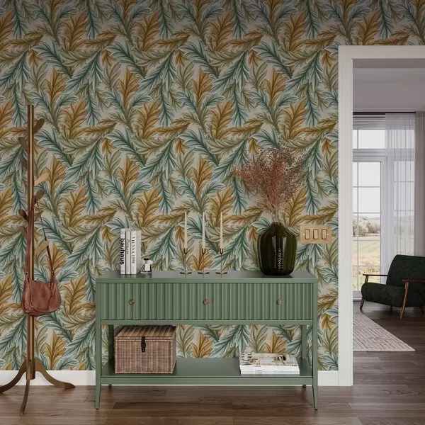 Tapeta Декоративно лишће у топлој окер и зеленој палети бр. a00673