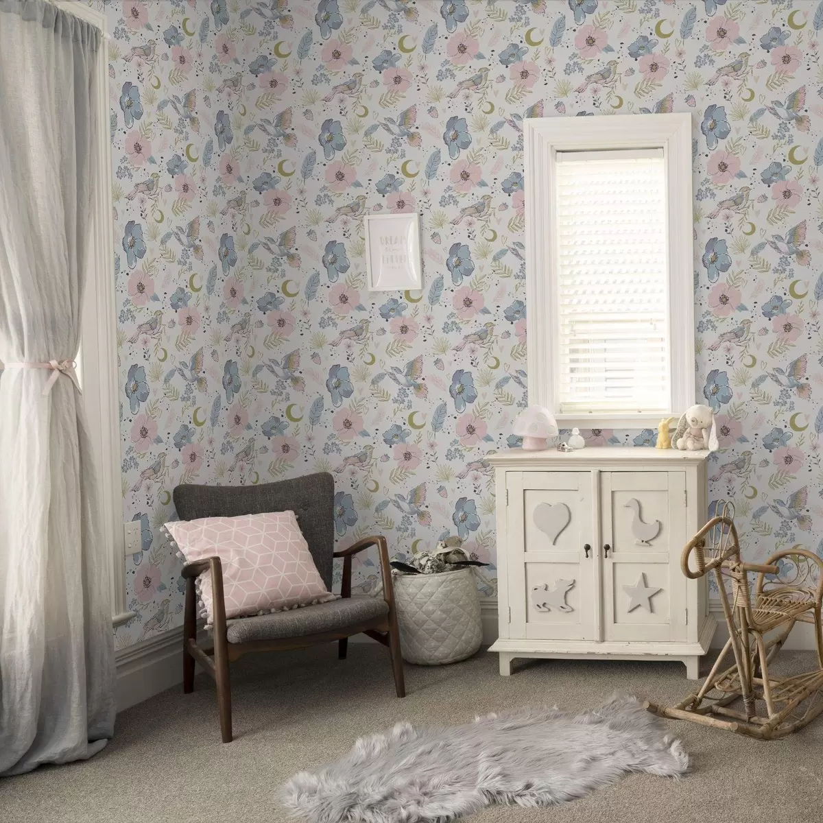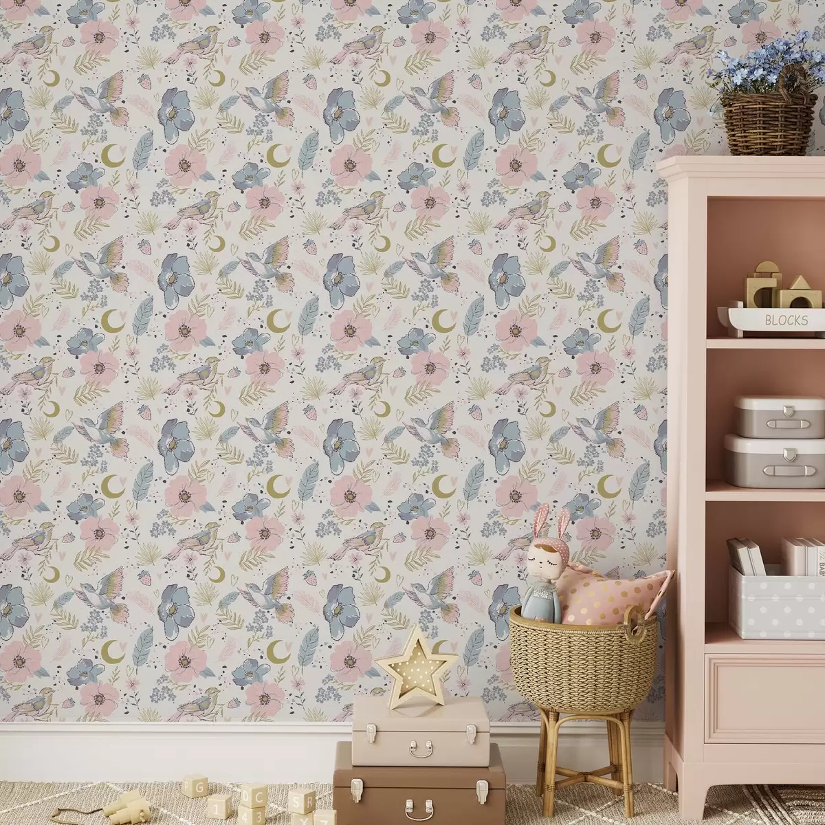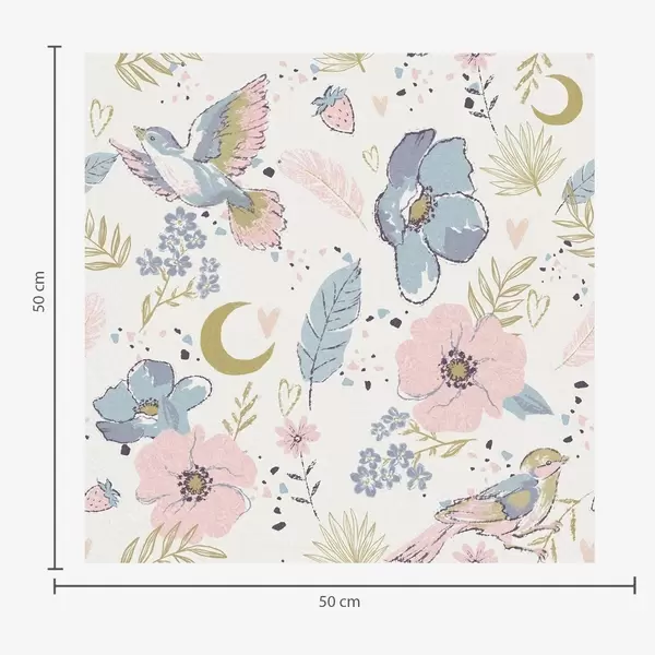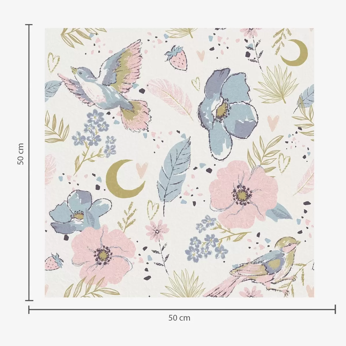 Tapeta Пастелне птице и цвеће са полумесецом на белој позадини бр. a00721