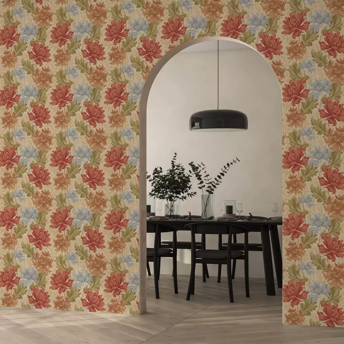 Tapeta Велике хризантеме у топлим нијансама на беж позадини бр. a00743