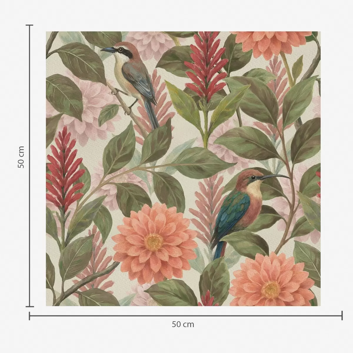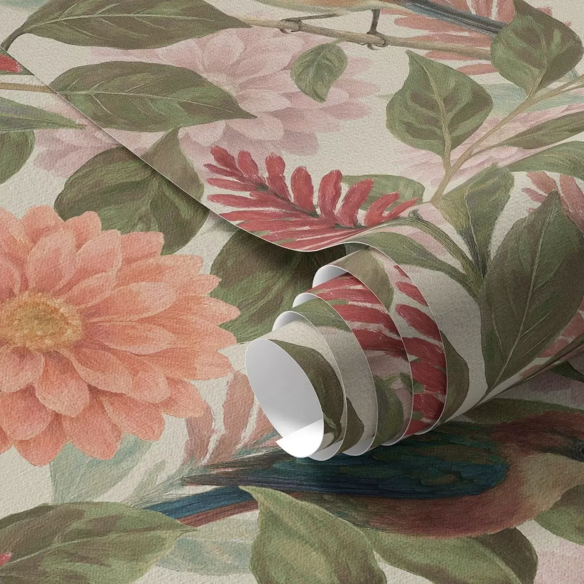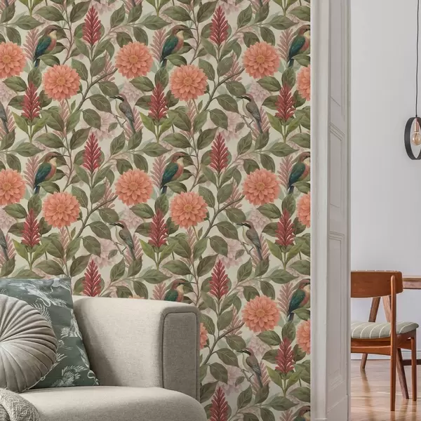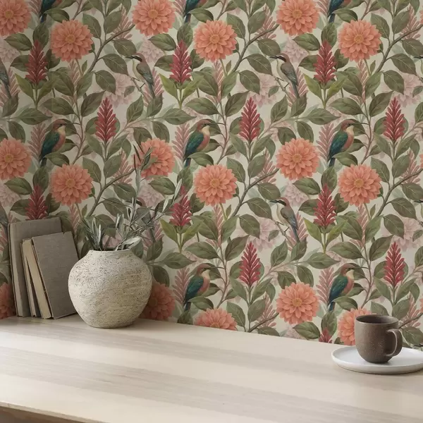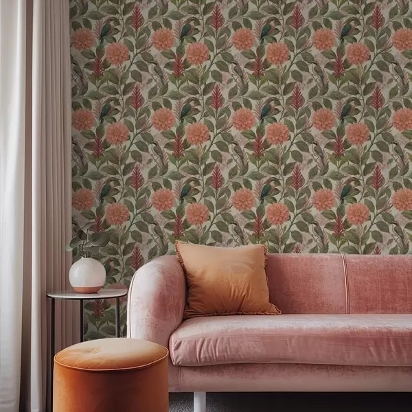 Tapeta Птице међу цвећем и лишћем у топлим тоновима бр. a00753