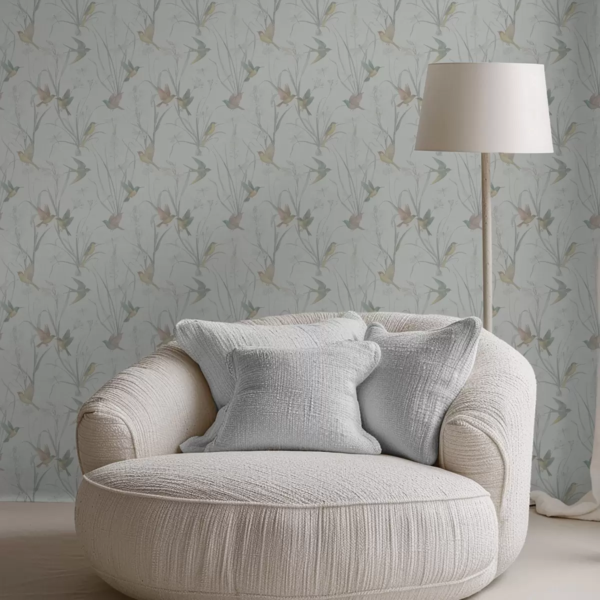 Tapeta Птице међу ливадским травама на светло сивом тлу бр. a00776v1