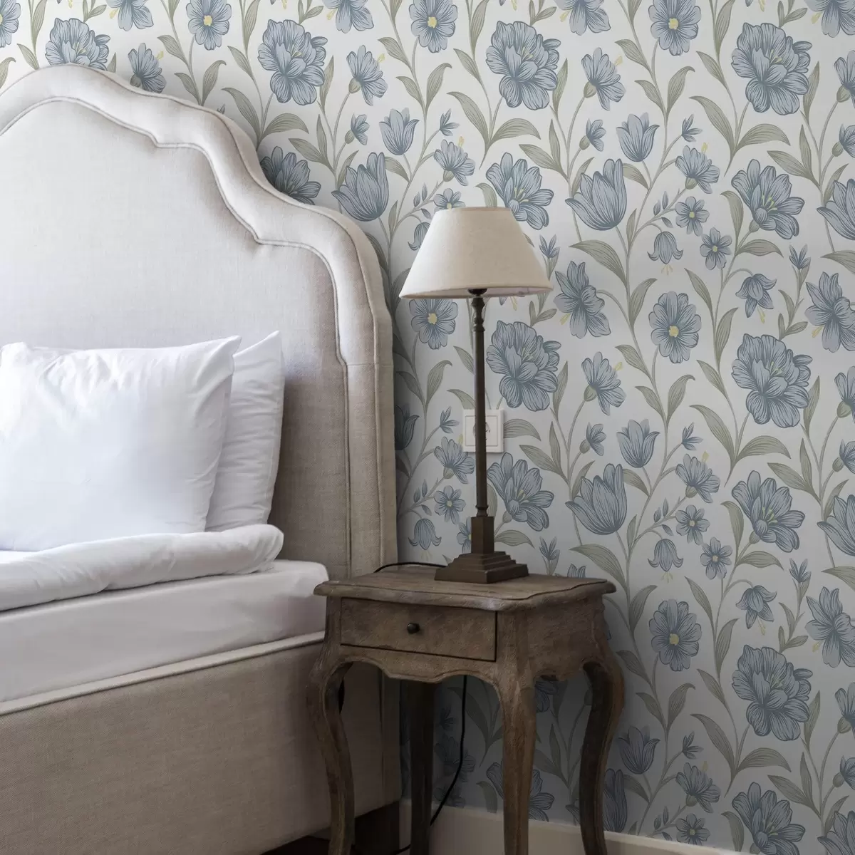 Tapeta Прашњаво плаво цвеће са листовима маслине на белој боји бр. a00780