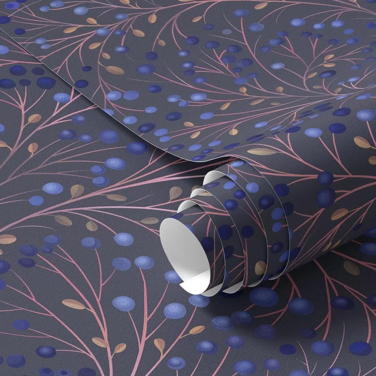 Tapeta Ружичасто-смеђе гране и плаве бобице на графитној позадини бр. a00787