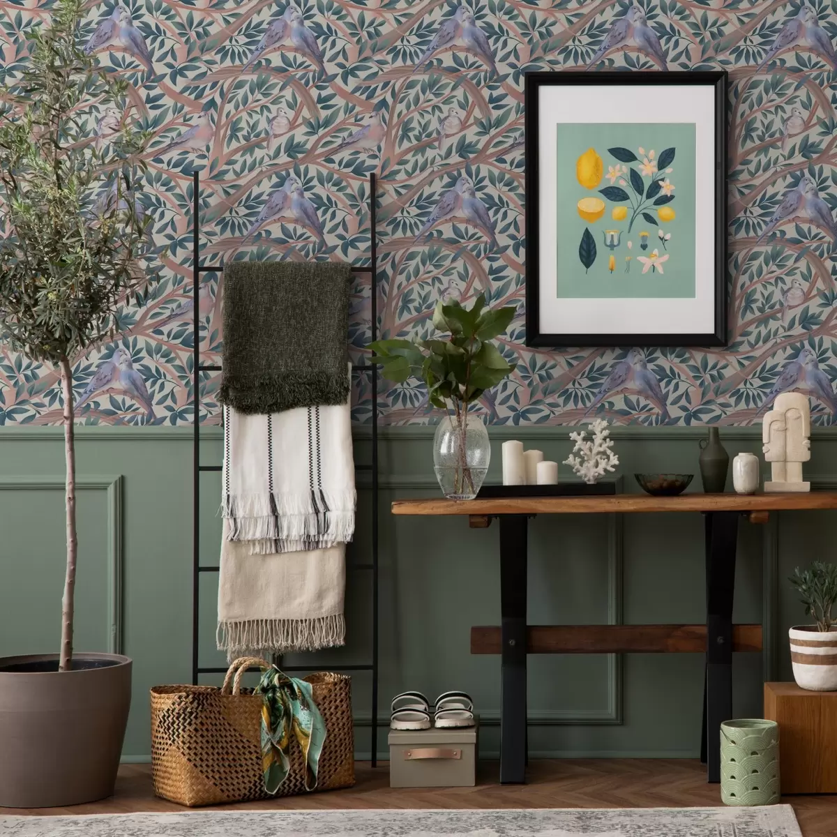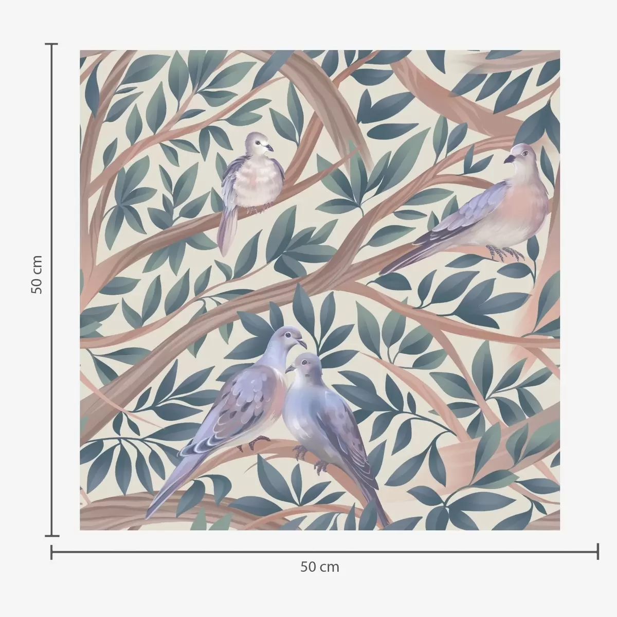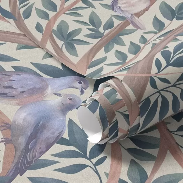 Tapeta Голубови међу гранама и лишћем у мекој пастелној палети бр. a00796