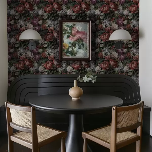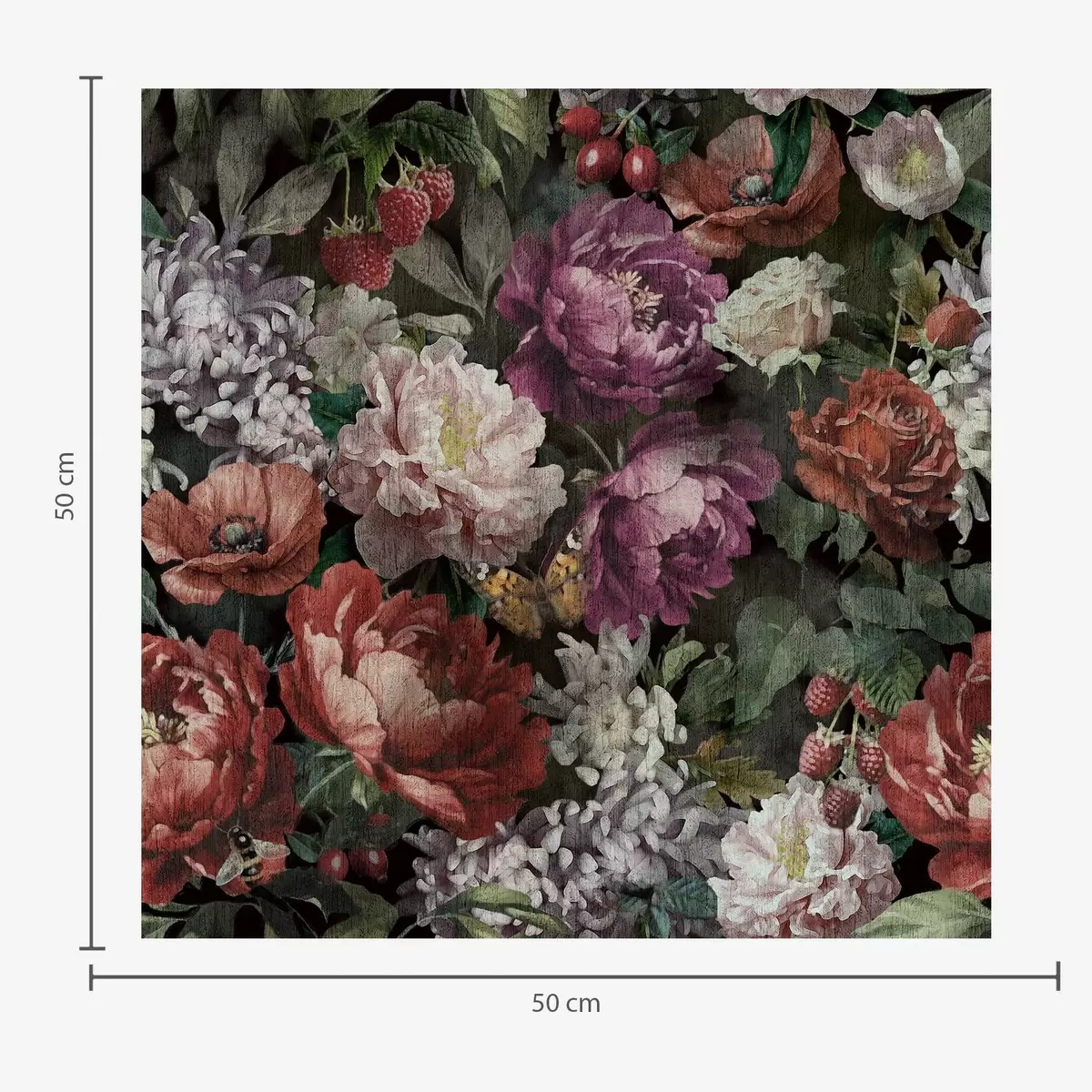 Tapeta Тамни драматични божури, бобице и лептир на црној боји бр. a00862