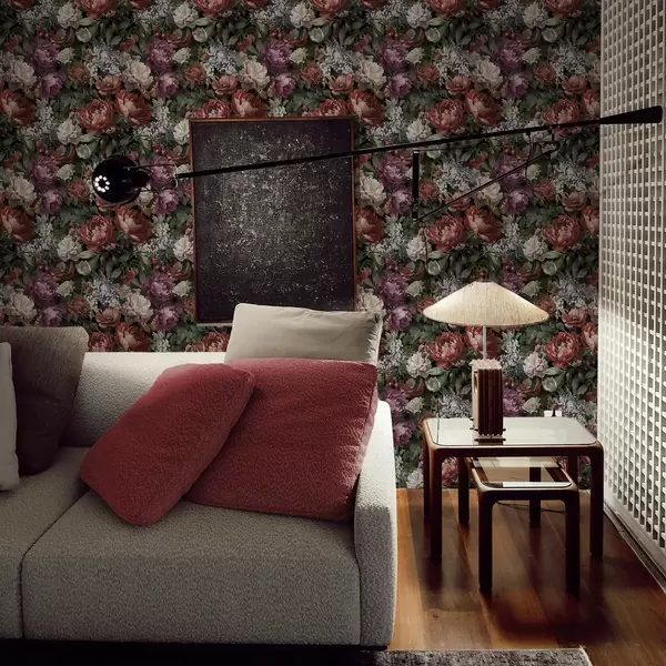 Tapeta Тамни драматични божури, бобице и лептир на црној боји бр. a00862