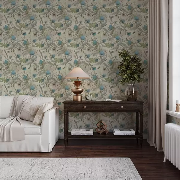 Tapeta Плави пупољци и листови на светло беж позадини бр. a00930