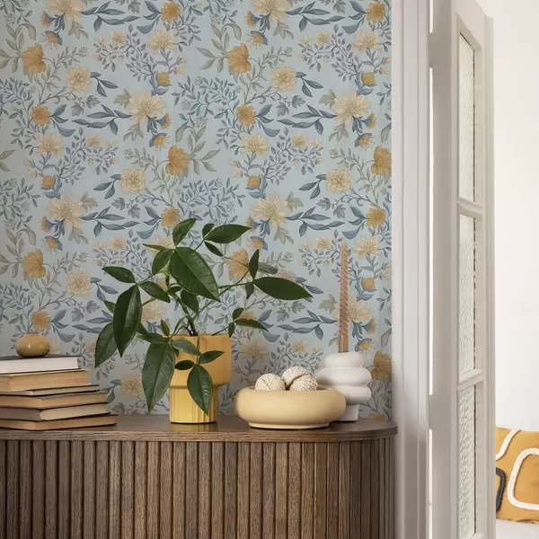 Tapeta Жуто и плаво цвеће са листовима на небеско плавој позадини бр. a00934