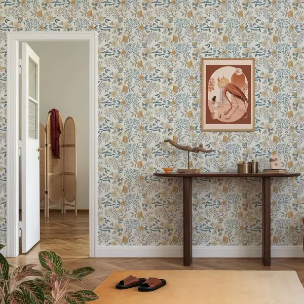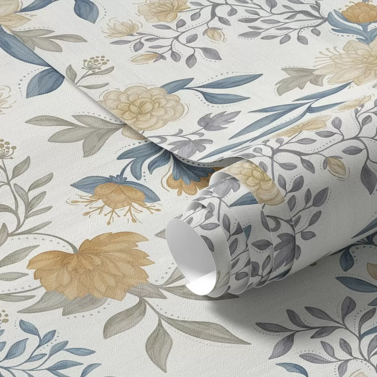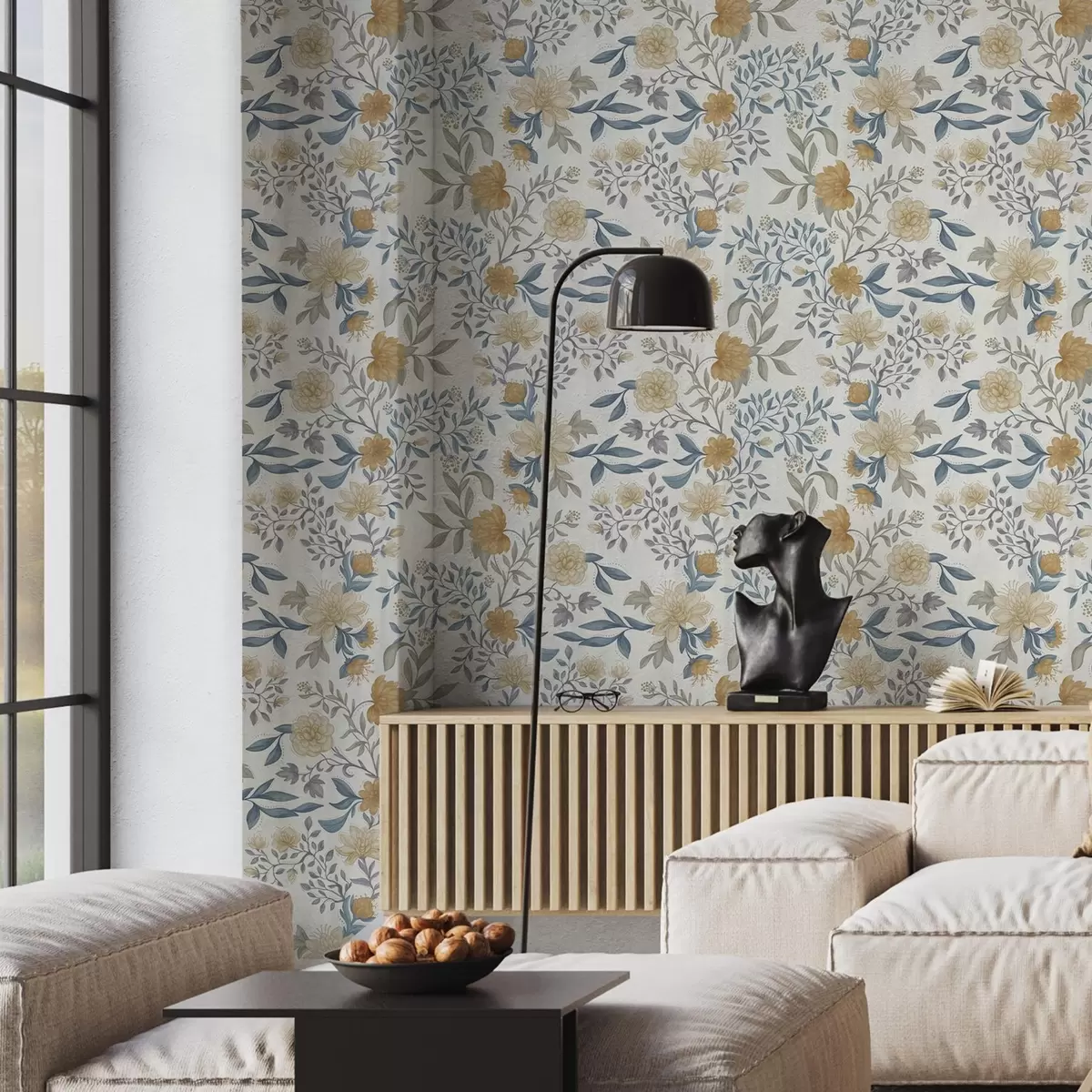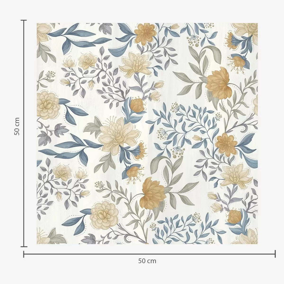 Tapeta Жуто цвеће и плаво зеленило на млечно белој позадини бр. a00934v2