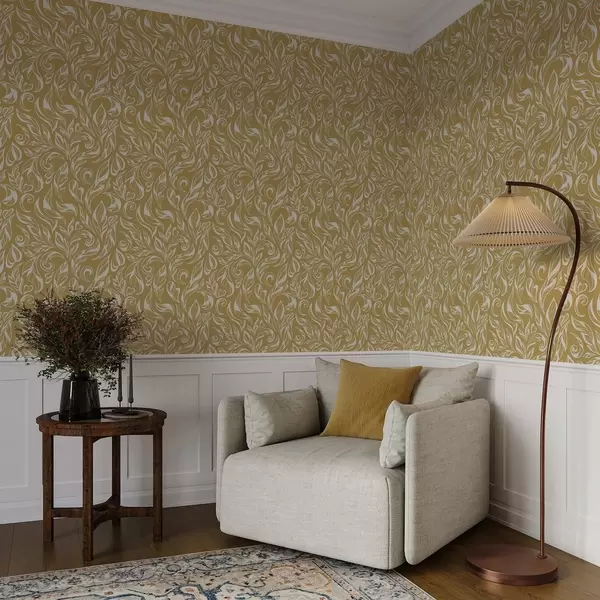 Tapeta Крем-бели лиснати орнамент на топлој окер позадини бр. a00940v1