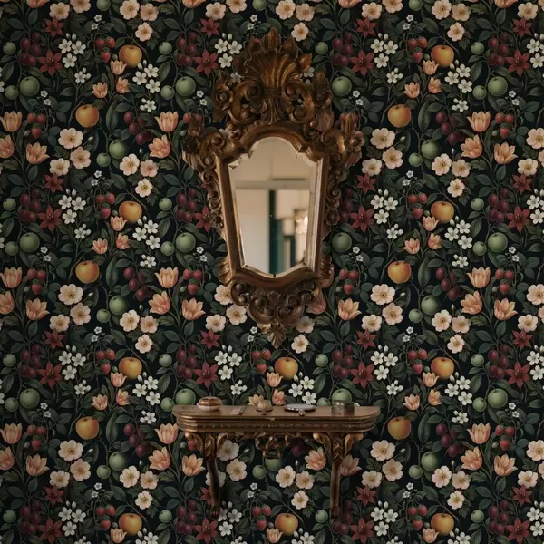 Tapeta Мрачна башта са цвећем, зрелим јабукама и бобицама бр. a01034