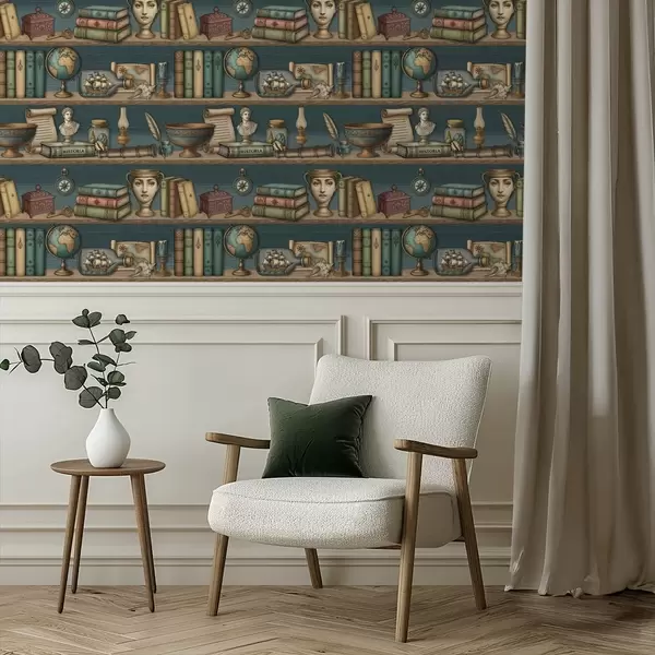 Tapeta Винтажне полице са књигама, глобусом и морским занимљивостима бр. a01036