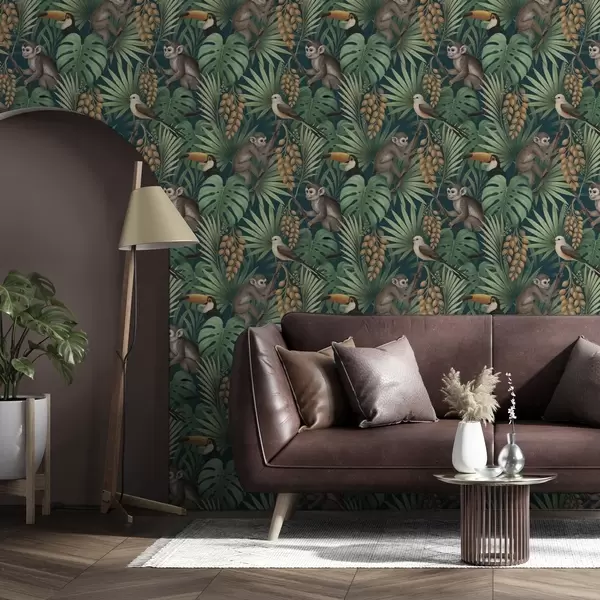 Tapeta Мајмуни и тропске птице у густом лишћу џунгле бр. a01037