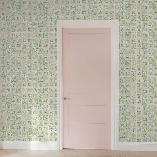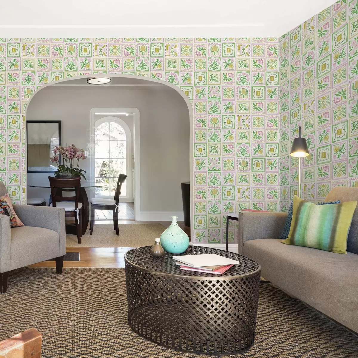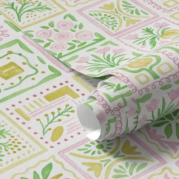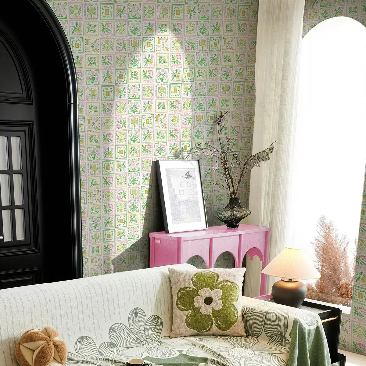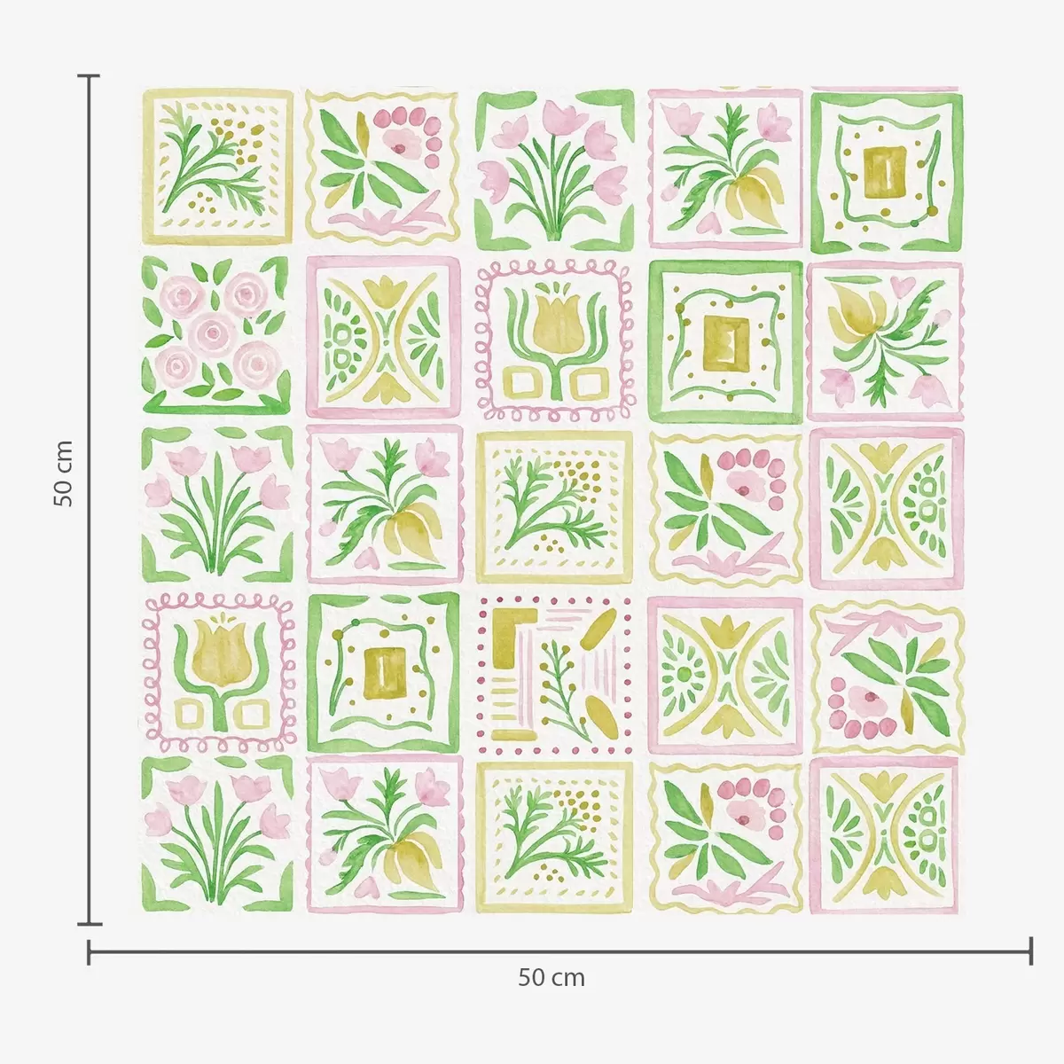 Tapeta Акварел квадратићи са ружичастим и зеленим гранама бр. a01082
